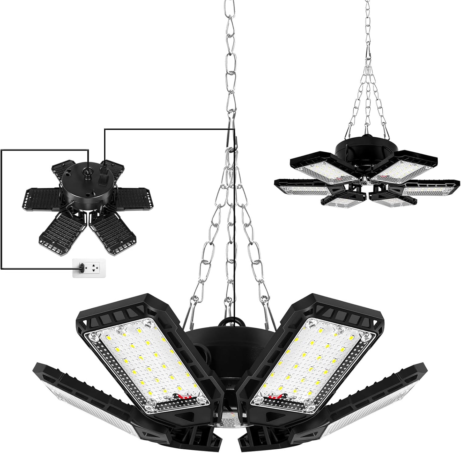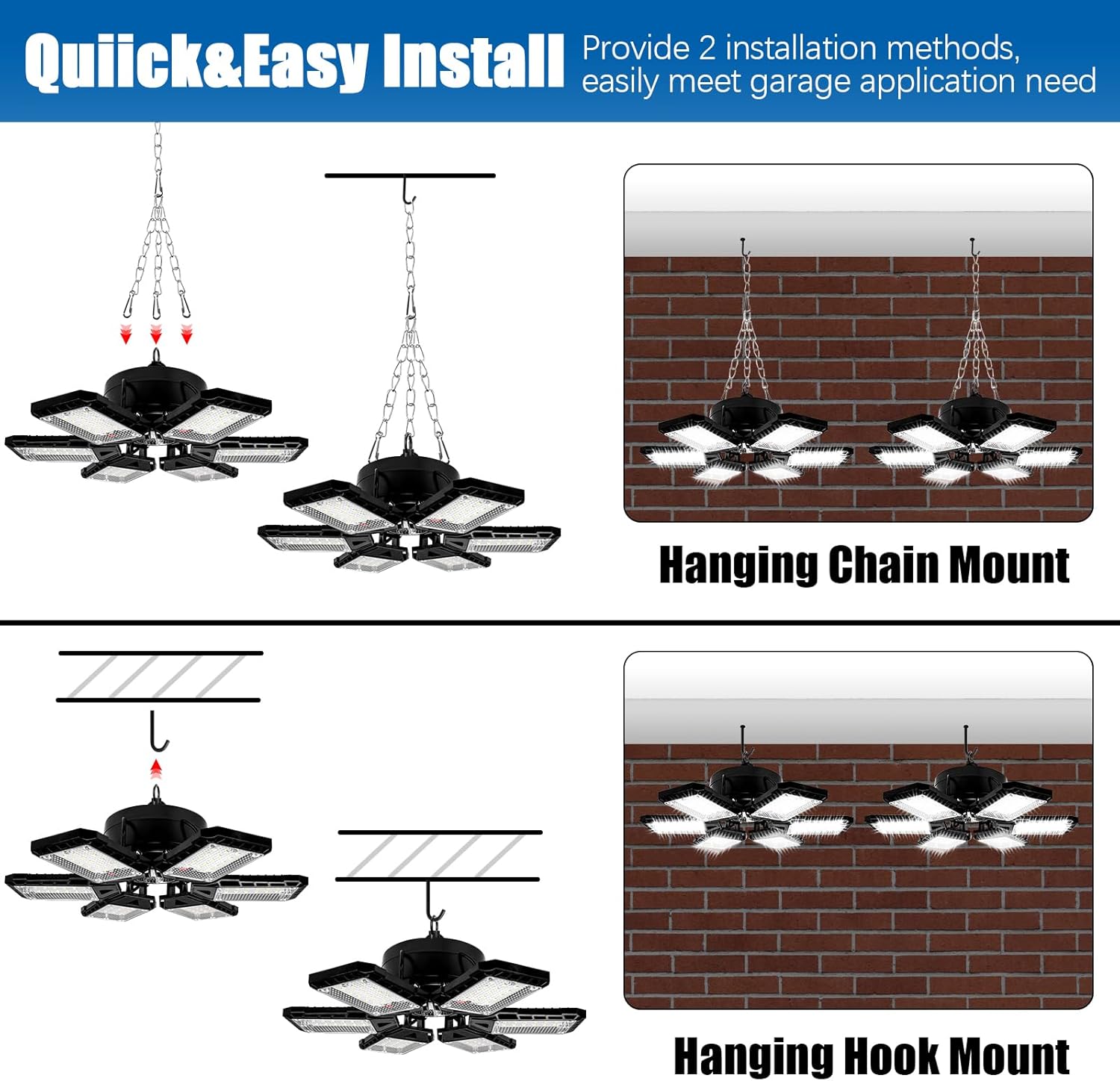 - 【6+1 Newest Garage Lights】With 6+1 deformable panels, the best led garage ceiling lights can be adjustable from 0 to 90 degree, which illuminate each corner of your garage in 360 full coverage without visual blind spots and dizziness. The workshop lights will provide better light than 3, 4 and 5 panel garage lights on the market.
