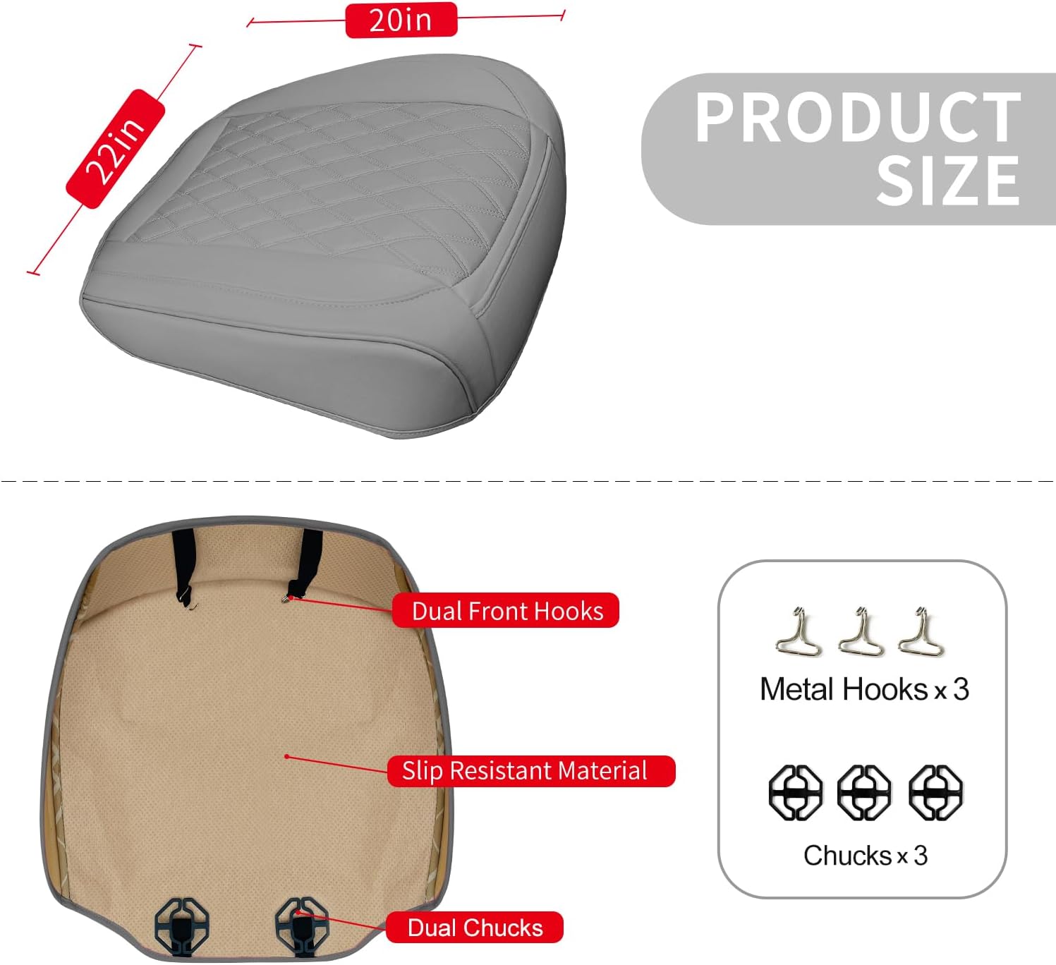 - Keep in place and easy to install: This front car seat cover has a non-slip gel bottom, with chucks and hooks to keep it in place well. It's also easy to install, insert the chucks into the gap between the seat back and the bottom, attach the hook under the seat bottom, then use the buckle to fasten the long elastic strap to the seat back, you can easily finish it in about 5 minutes Install.