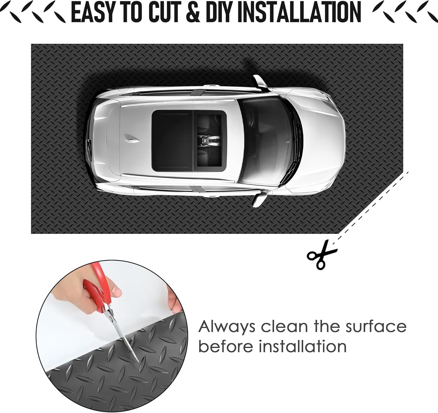 - Easy to Clean and Cut: Customize heavy duty garage floor mat effortlessly with scissors or a sharp knife. Plus, our garage flooring roll is easy to clean, whether you use a vacuum, broom, or mop, you can keep them looking great without any hassle, and it is easy to take care of after laying, easy to clean, and cleans after wiping