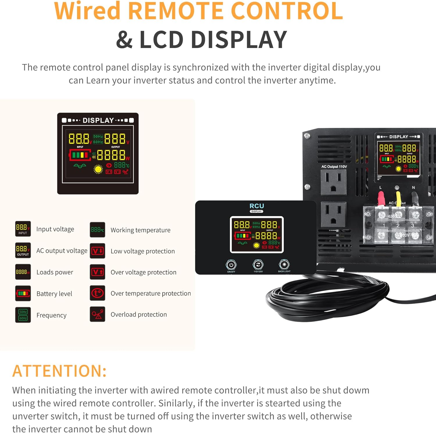 - 【LCD Display & Wired Remote Control】 The 24V power inverter displays real-time input and output voltage, providing clearer and more important usage status information (battery voltage and output power). A wired remote control is more convenient to operate a pure sine wave inverter
