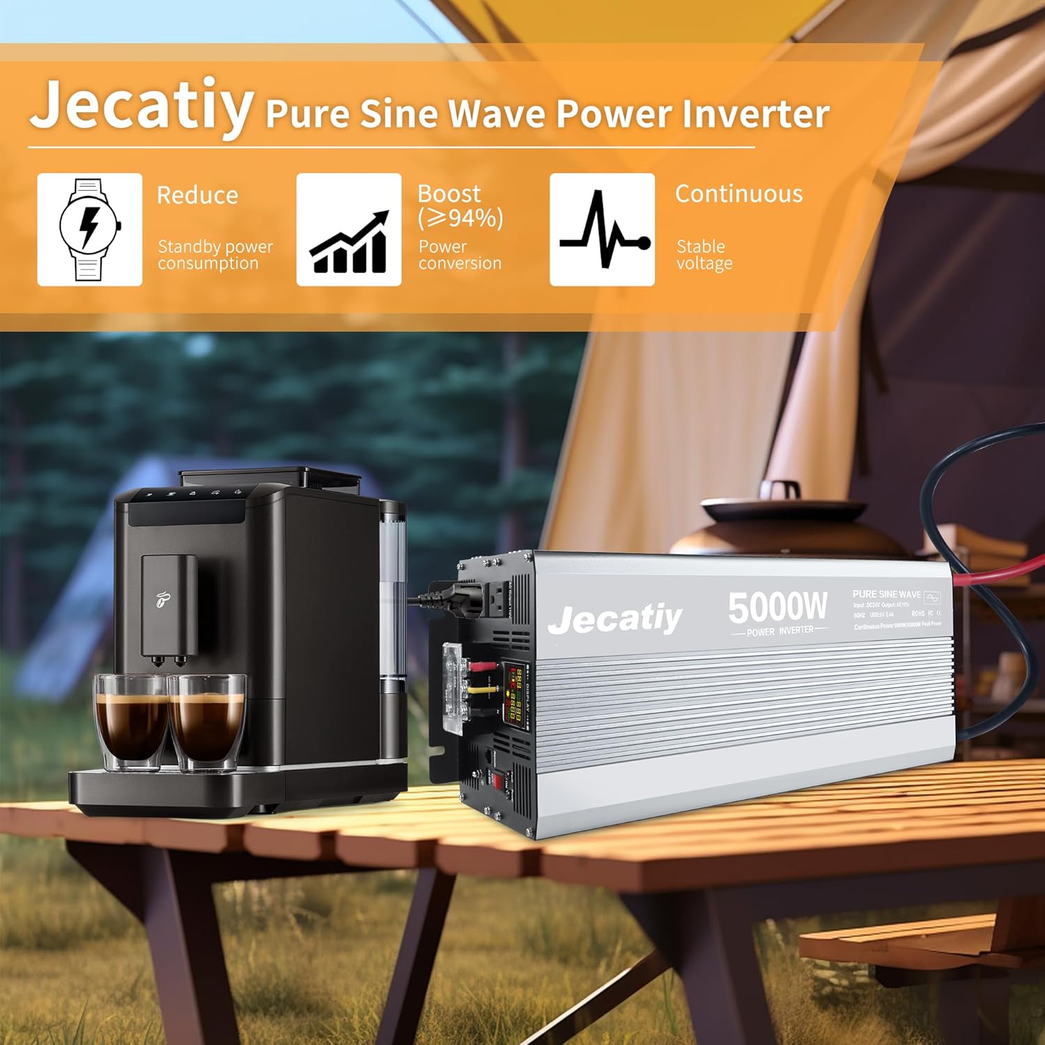 - 【High Conversion Efficiency】Advanced pure sine technology with high-quality AC equal to mains power, which is the same power used by household appliances, has up to 94% conversion efficiency, and greatly reduces conversion consumption. The Jecatiy power inverter is efficient and safe