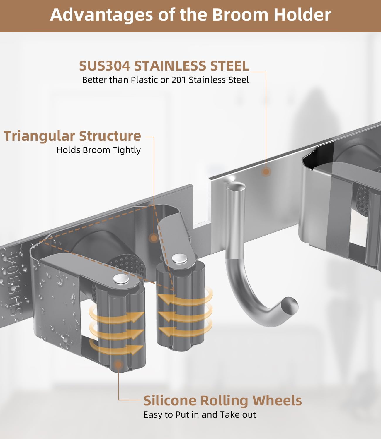 - 304 STAINLESS STEEL , ANTI-RUST & STURDY: The mop and broom holder wall mount is made of 304 stainless steel, making it corrosion-resistant, moisture-proof, and waterproof. Compared with plastic broom racks, it is stronger and more durable. This garage organization can hold up to 30 pounds when installed with screws, and the hook can also support your steam mop.
