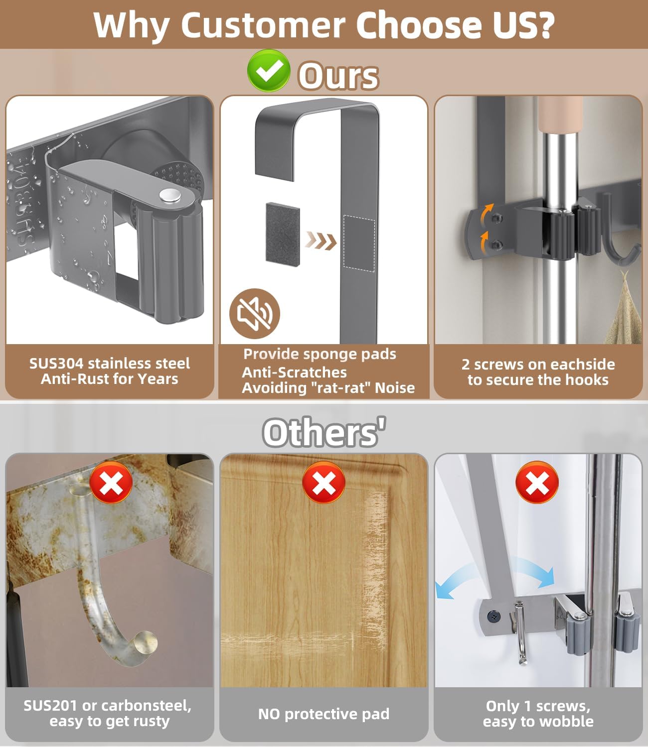 - HIDE YOUR TOOLS BEHIND THE DOOR:This specially designed Over-the-Door Broom Holder comes with two over-door hooks,eliminating the need for drilling.This drill-free design allows you to utilize the space behind the door, making it a versatile and damage-free solution. Maximize efficiency and eliminate floor clutter by organizing brooms, mops, and other cleaning tools.(This metal broom holder also comes with Anti-Scratch self-adhesive SPONGE PADS to reduce Rat-Rat noice and protect your door).