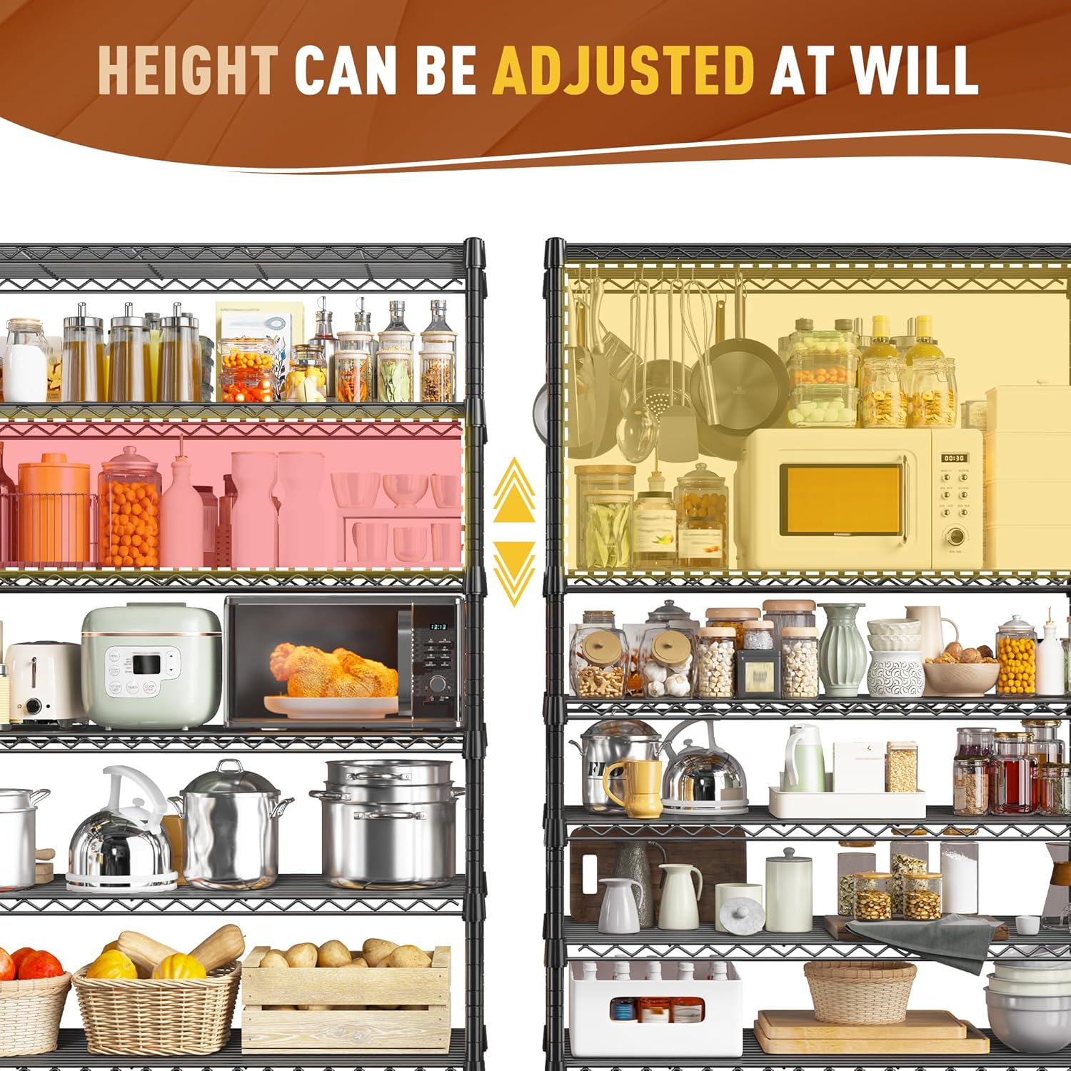 - 【Height adjustable & Split into 2 Shelves & DIY Free Combination】 The shelving heights are all 100% customizable. You can put the wire shelving board at any height you want from the floor to the top of the shelf poles. Metal storage shelves can be split into 2 Shelves as workforce as you need. If you wanna be an organized expert, try this wire shelving rack