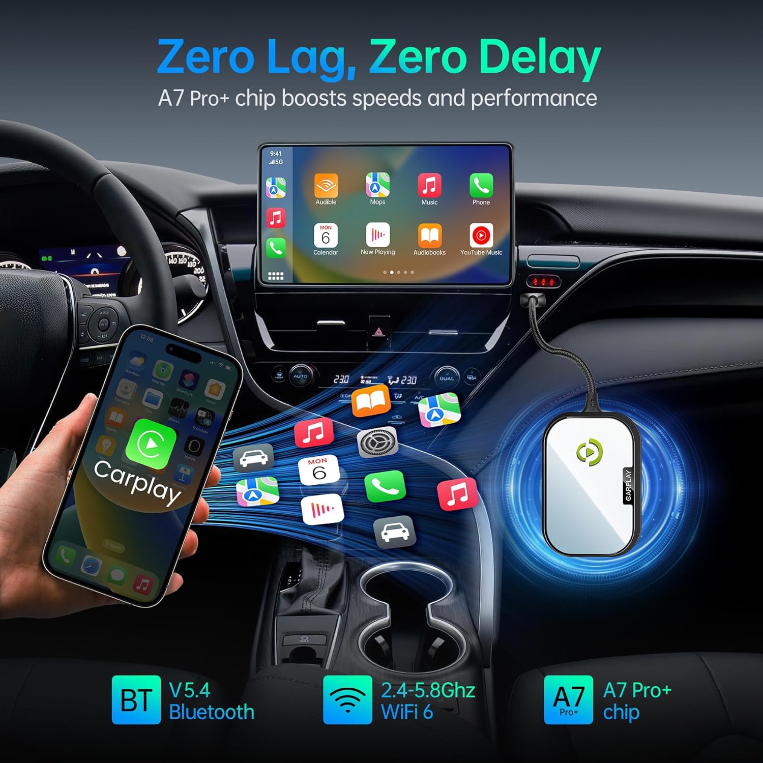 - Stable Connection: Upgraded with a 2024 advanced smart IC chip and processor for a robust, fast, and stable wireless connection, minimizing interruptions and latency. Also supports voice control, steering wheel, touchscreen, and knob operations.