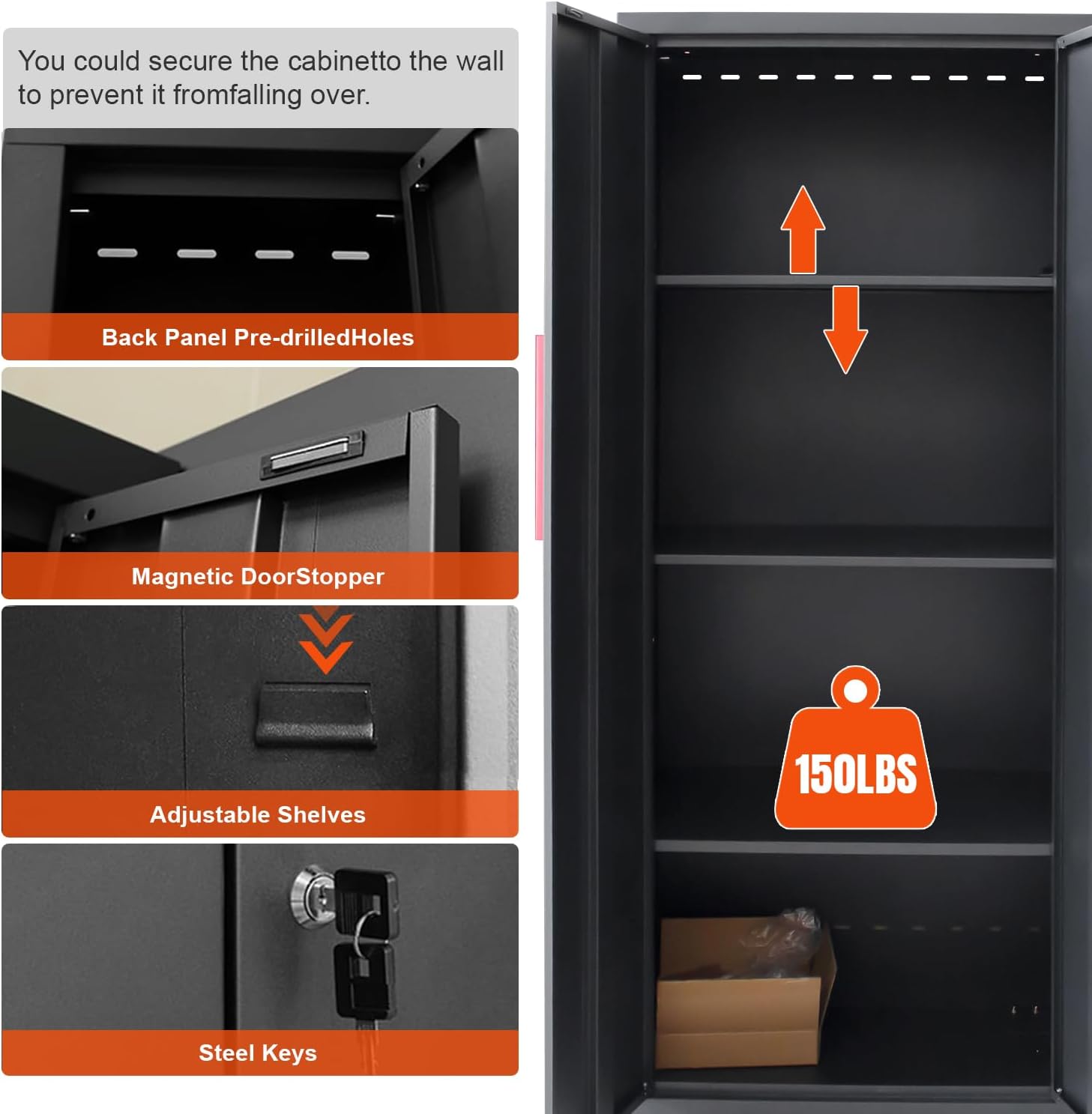 - Multi-functional Cabinet: The tall locker of garage organization comes with 2 doors and 3 adjustable shelves, which can be positioned at different heights based on your storage needs. This adjustability enables you to customize storage configurations and accommodate items of various sizes and volumes effectively. Each shelf in the cabinet is capable of bearing up to 150 pounds of weight. The cabinet also includes adjustable leveling feet. By adjusting the feet, you can ensure that the cabinet remains stable and secure on uneven surfaces