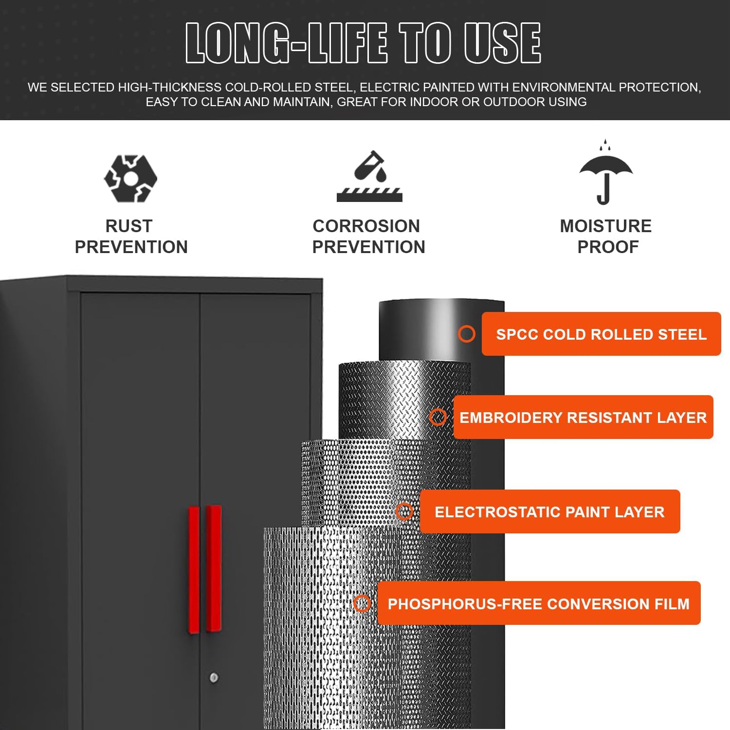 - Reinforced Structure: The heavy metal cabinets with furniture locks are constructed using 100% cold-rolled steel, ensuring their strength and durability. The cabinet features a thickness of 0.8mm. With all-welded construction, this reinforced structure enhances the overall strength and stability of the cabinets, making them more resistant to damage and deformation. It's coated with a newly developed coating, which provides strong wear resistance, protecting the cabinets from scratches, abrasions, and other forms of damage