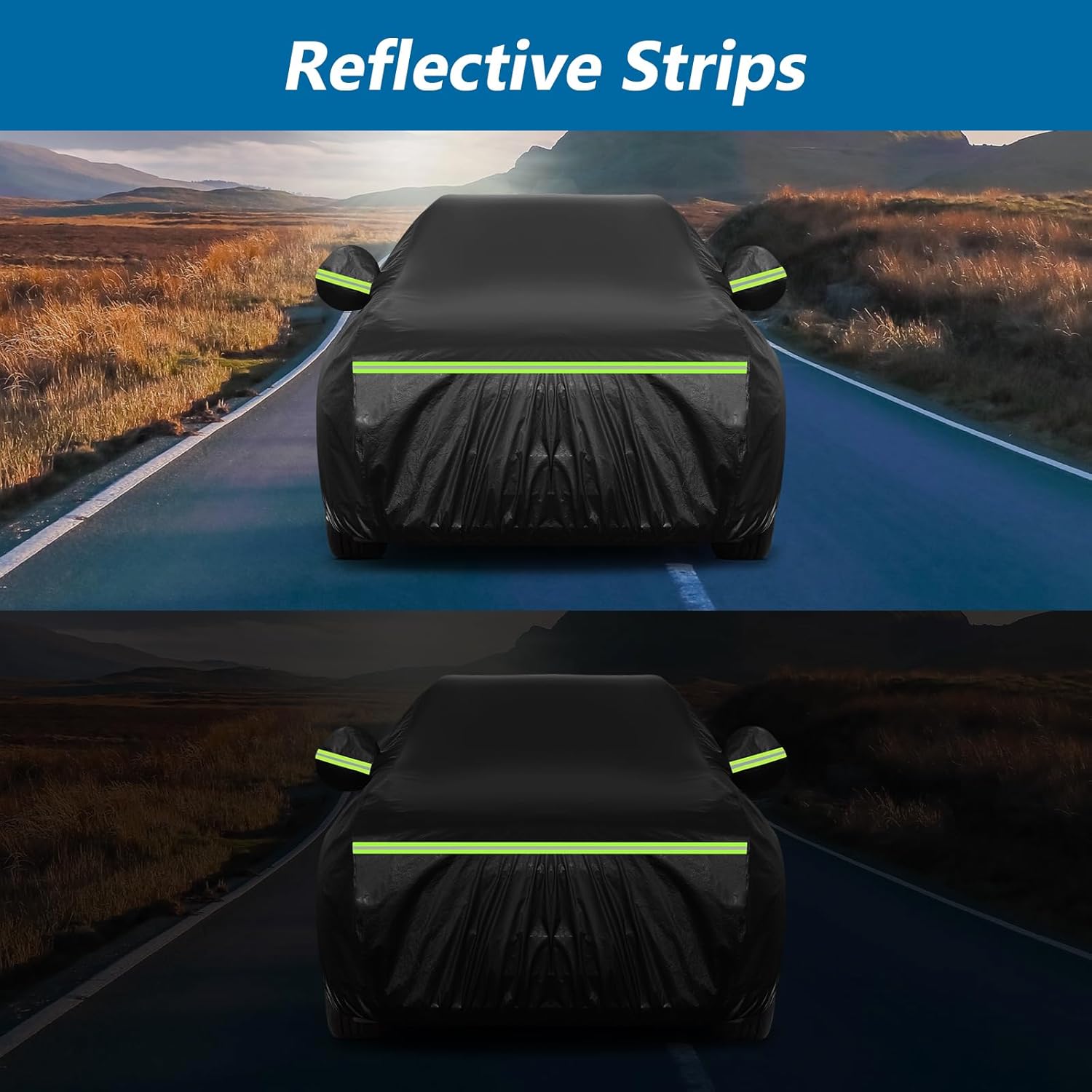 - 【Reflective Strips and Driver-Side Zipper Designs】(1) Black Coating: UV protection and heat-proof, prevent cracking and aging of inner decoration leather and plastic. (2)5 Reflective Strips attached on the front DRL lamps, middle Turning lights, and Rear taillight to prevent collisions during the night. (3)It has four straps, a windproof buckle, and a storage bag. (4)Mirror Pocket: protect the rearview mirror in all directions. (5) A zipper on the cab side for convenience.