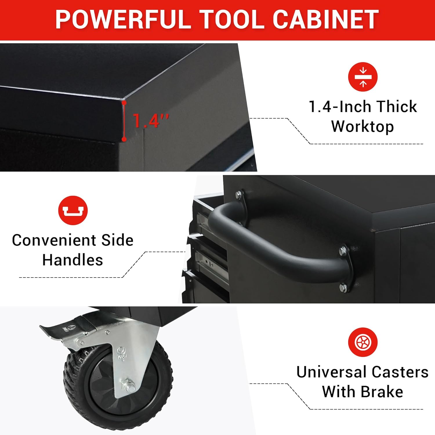 - SOLID CONSTRUCTION: This standing large toolbox with drawers is made from 20 gauge thick steel and a 1.4-inch thick wood top, which promises durability and longevity. It also comes with a flat key locking system that secures the cabinet.