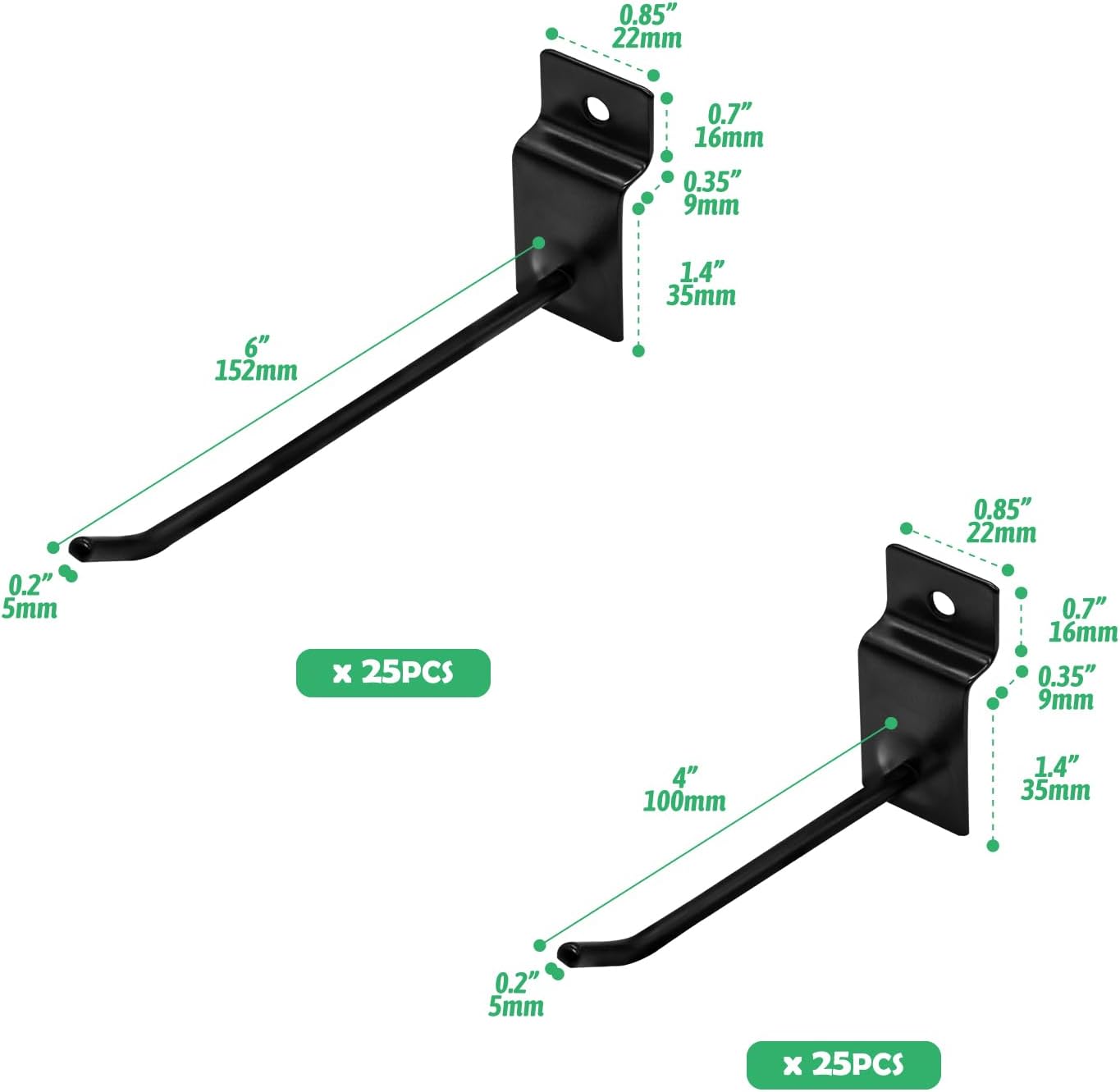 - [What you Get] The black slatwall accessories kit contains 25pcs 4”/ 10cm slatwall hanger hooks, 25pcs 6”/ 15cm slatwall hanger hooks, totally 50pcs. The nice the combination of enough quantity will meet your space planning or replacement needs.