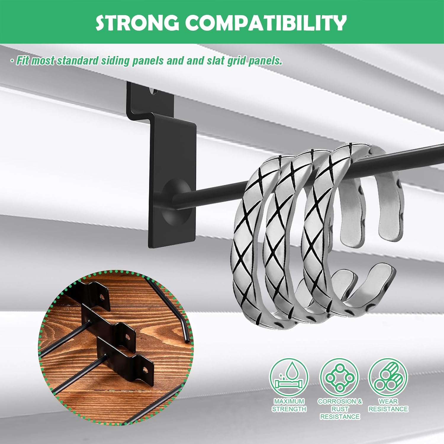 - [Easy to Use] No tools required. Fit most standard siding panels and and slat grid panels. Place hook to both sides of the the panel slot, fix it into the slot on the panel then press down rod body and slide it to anywhere you like to fit, then lay them flat and hang what you need on above. Effectively creating room for your workspace or home.