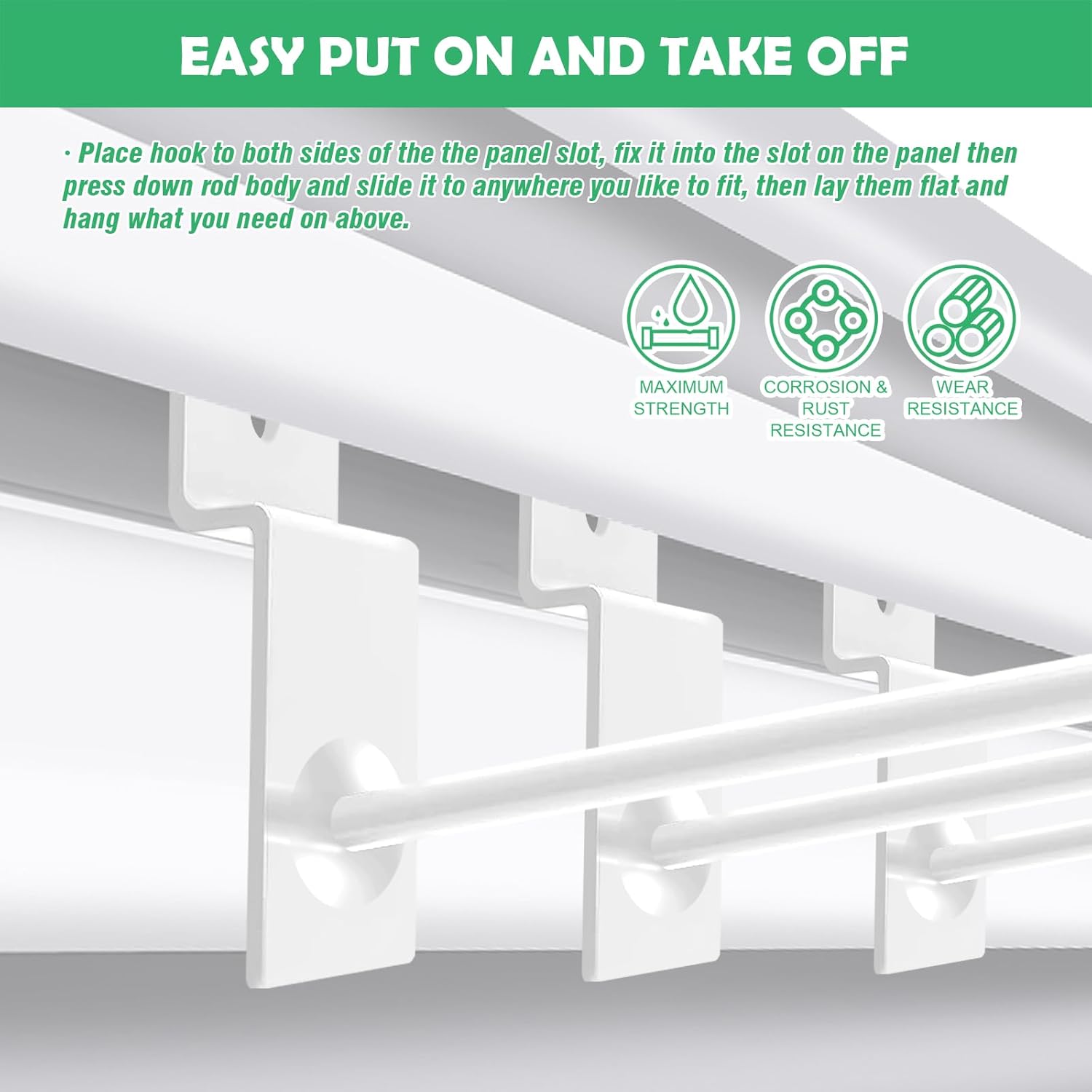 - [Easy to Use] No tools required. Fit most standard siding panels and and slat grid panels. Place hook to both sides of the the panel slot, fix it into the slot on the panel then press down rod body and slide it to anywhere you like to fit, then lay them flat and hang what you need on above. Effectively creating room for your workspace or home.