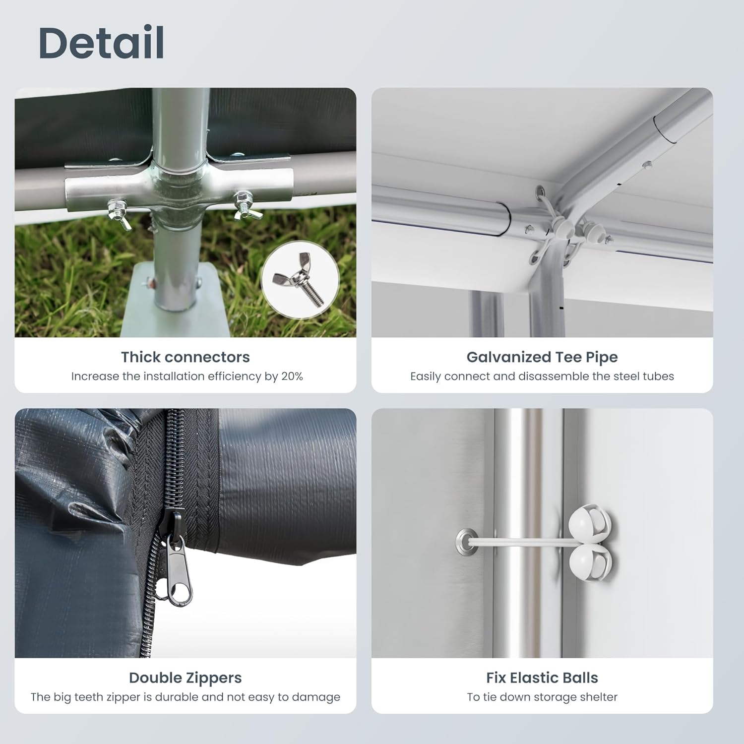 - 【Removable Roll-up Dual-zipper Doors】Easy access and better visibility. The doors with double zippers and buckles can be removable or rolled up. Doors at the front and back of the storage shelter for easy entry and exit, better visibility and facilitate air circulation.