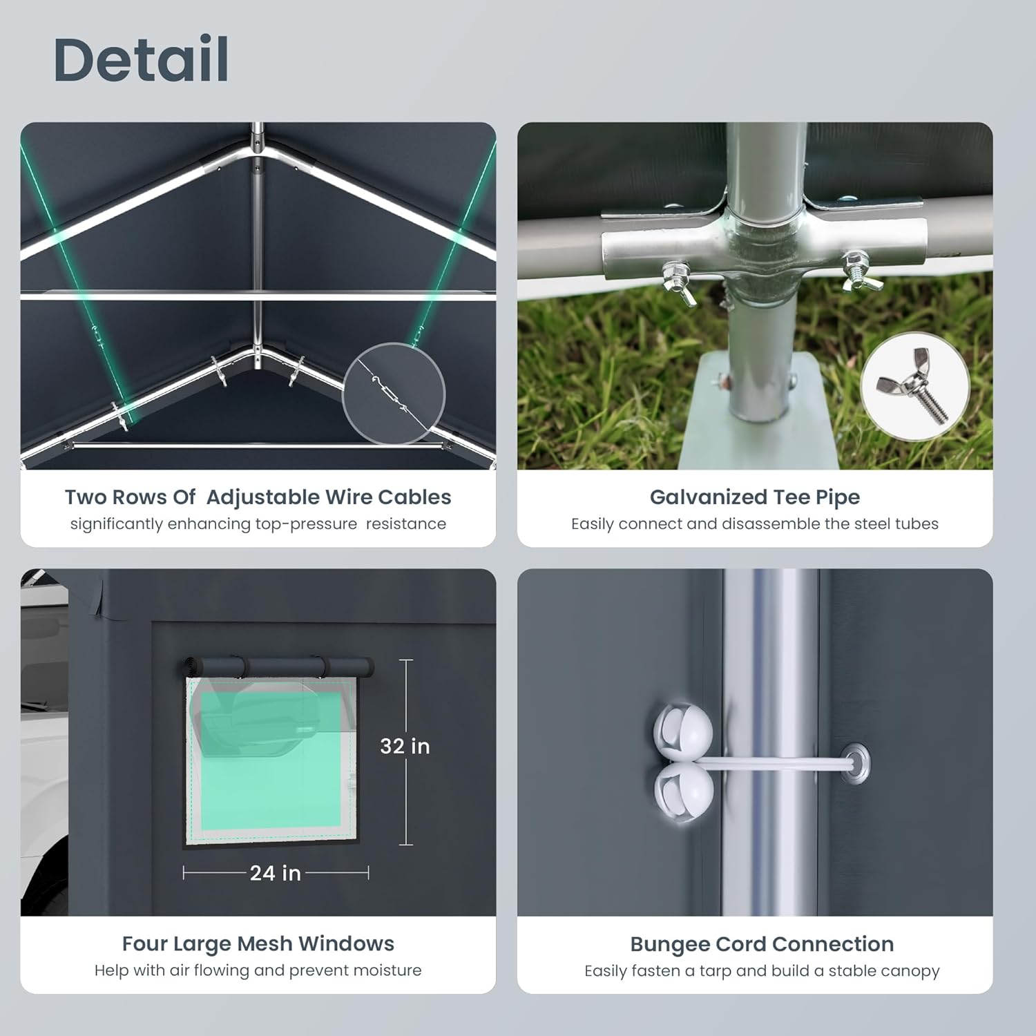 - Removable Rollup Dualzipper Doors: Easy access and better visibility. The doors with double zippers and buckles can be removable or rolled up. Doors at the front and back of the storage shelter for easy entry and exit, better visibility and facilitate air circulation.