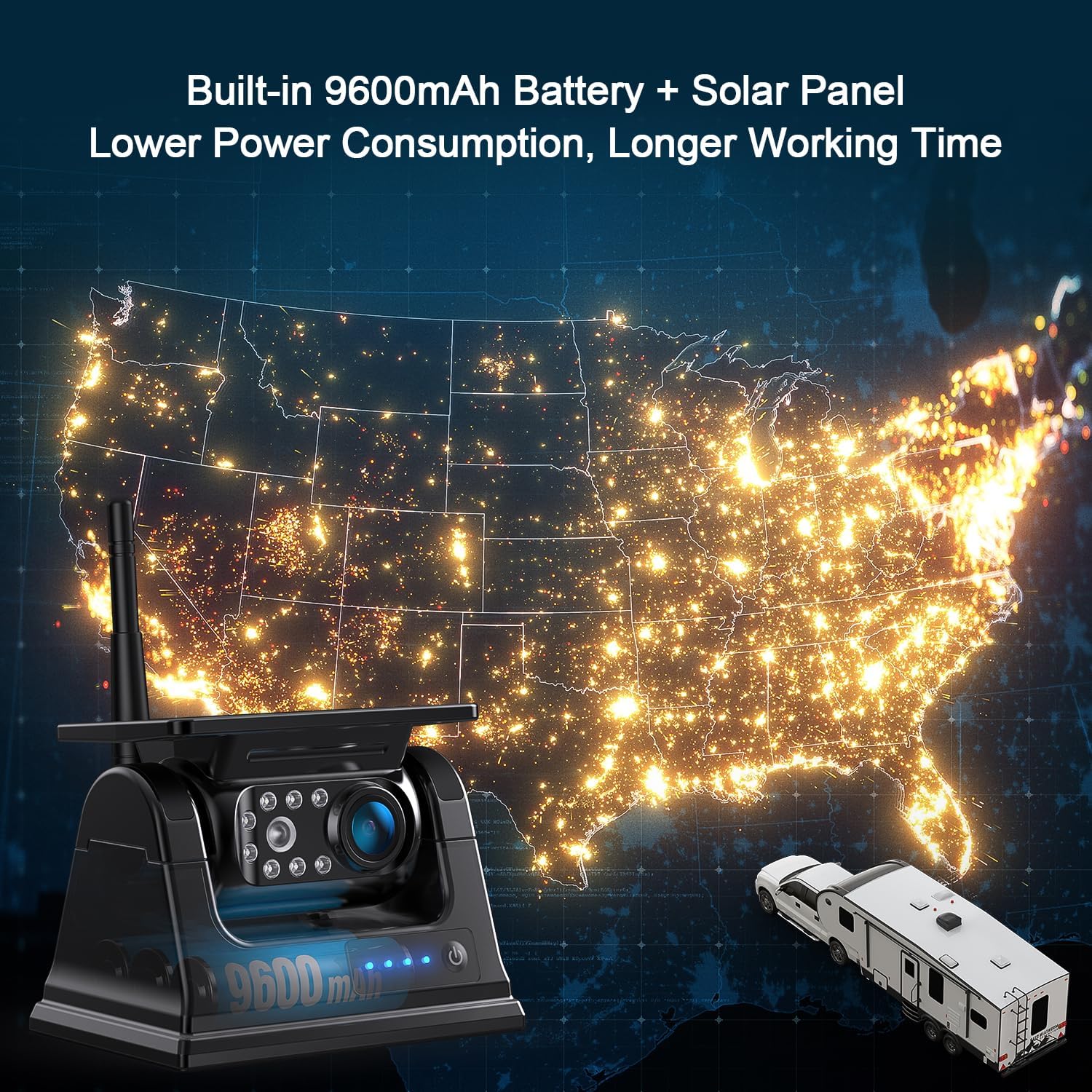 - Solar Panel & Rechargeable 9600mAh Battery : Built-in battery, it's a truly wireless backup camera system, no wires required! With 9600mAh high-capacity battery and solar panel assisted charging, this backup camera can work continuously for a longer time. When needed, please use the included Type-C cable and charger to charge the camera.