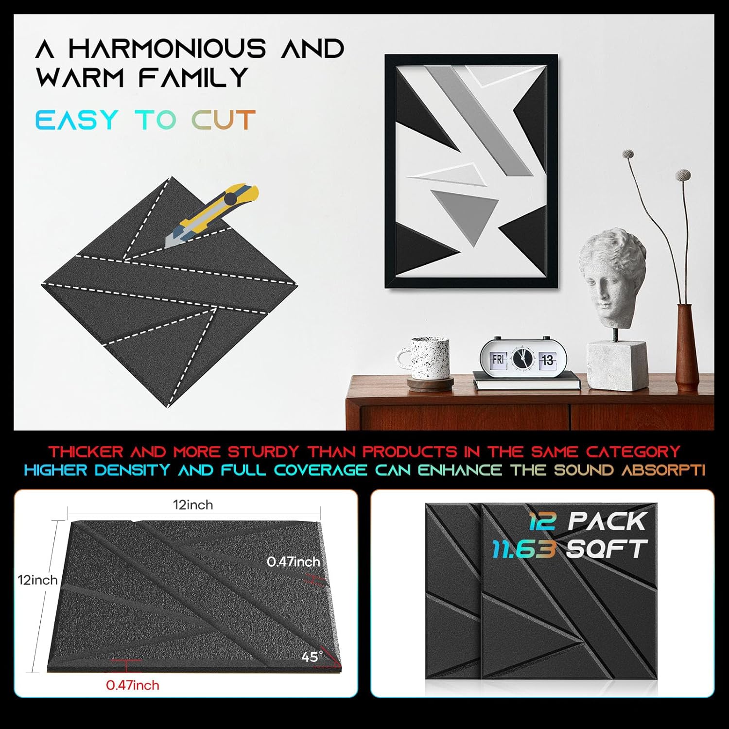 12 Pack Self-Adhesive Soundproof Wall Panels, 12 x 12 x 0.47 In Sound Proof Foam Panels for Walls, 1.2lb/ft³ High Density, Thicker 0.47in, Acoustic Panels, Noise Dampening Panels Studio Black