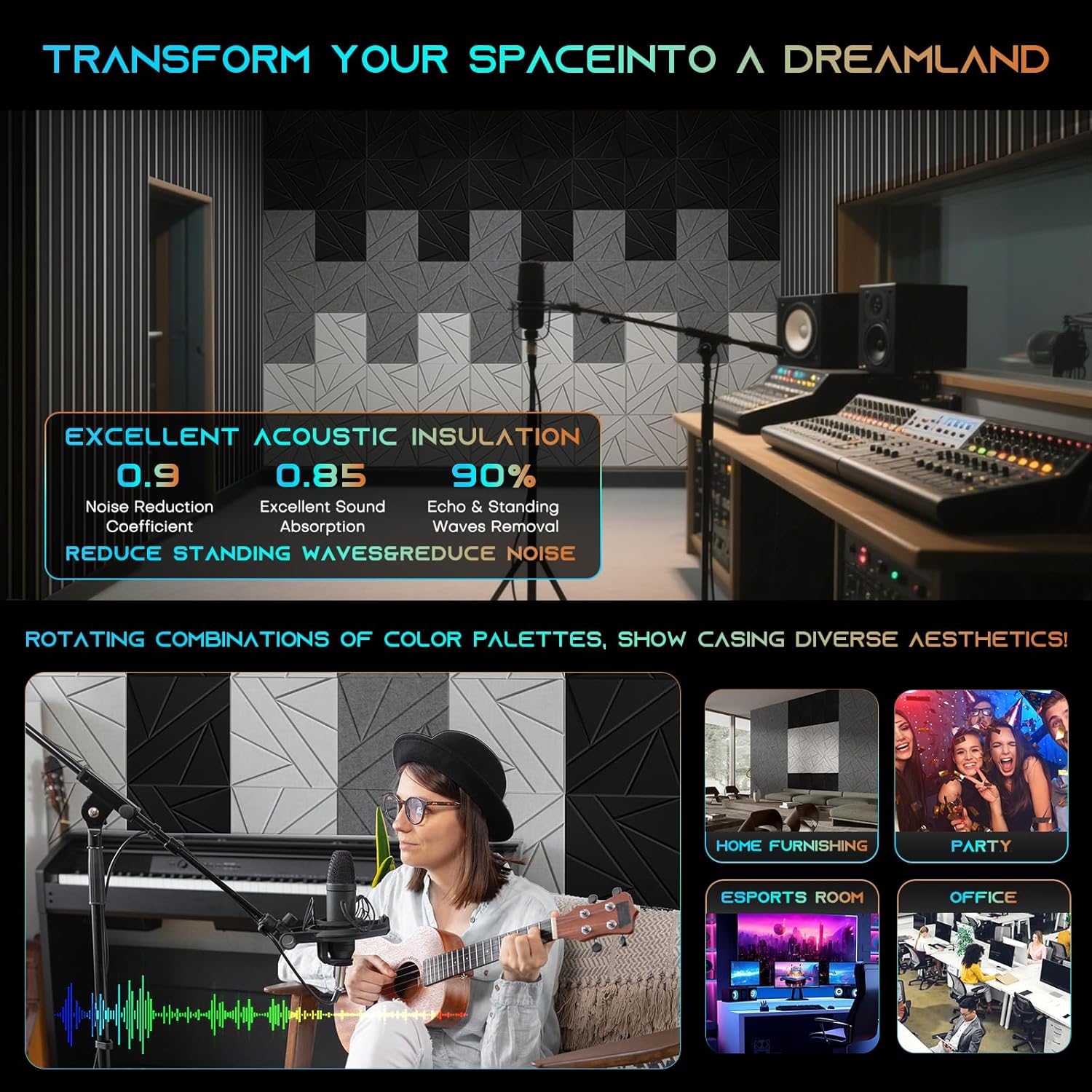 - 【Perfect DIY】: Soundproof wall panels with modern design concepts provide your space with unique decorative charm. Adopting a beautiful design with 45° chamfers, the wall noise blocker with this unique design pattern can be freely spliced and placed. You can assemble it into any DIY shape according to your decoration needs. It has strong plasticity and different rotation directions can create different patterns, making the space layout more flexible and beautiful.