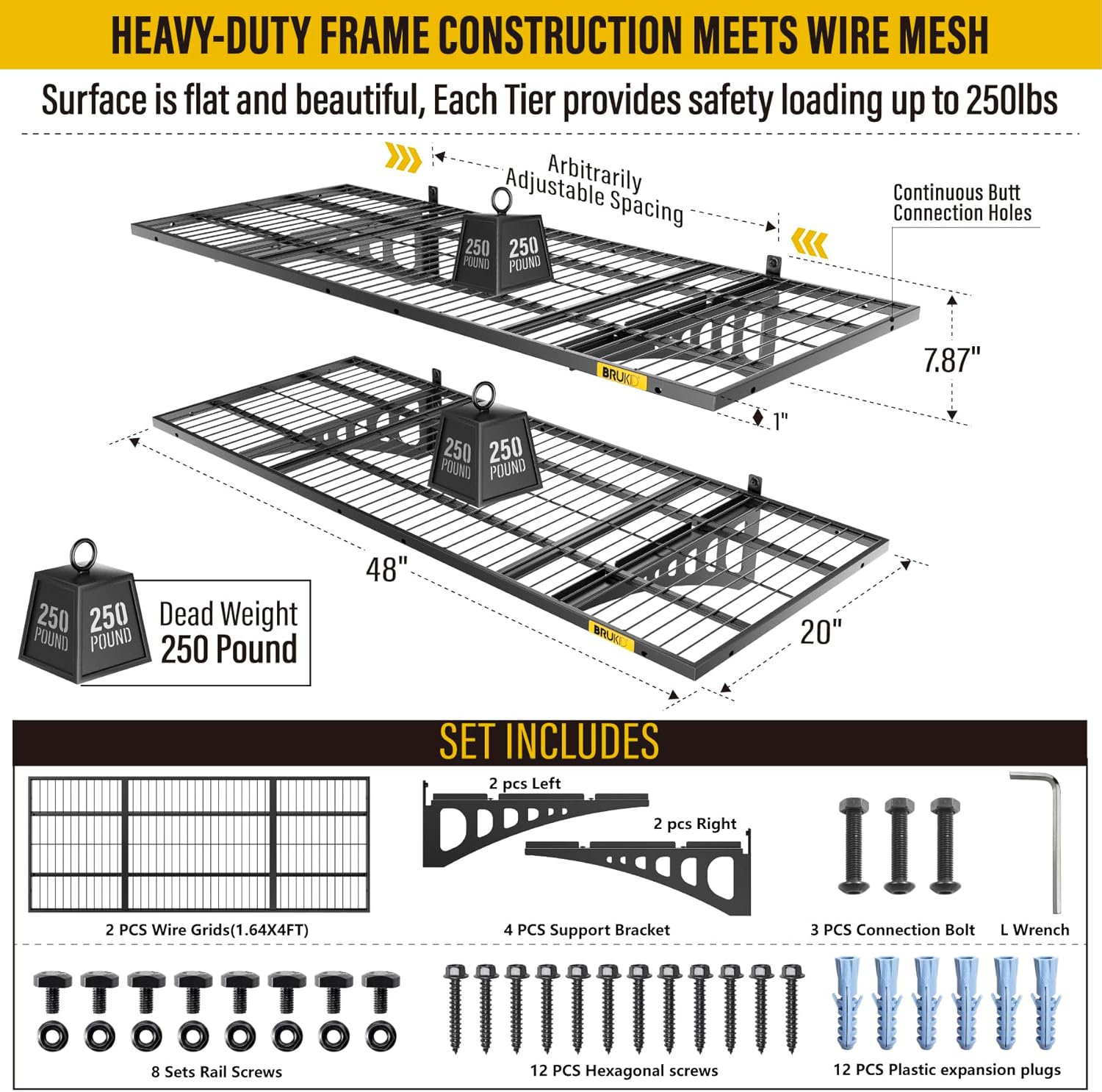 - KIT INCLUDES:Includes 1pc-Grid Shelf; 2pc-Brackets; 6pc-Hexagonal screws (Hardened ∅0.2" L/2"); 4Sets-Rail attachment bolts; 1pc- Drill bit; 1pc-Socket; 1pc-installation manual. All hardware of Brukid Professional Series Wall Mounted Shelf are under strict quality control and testing, We strive to provide our customers with a quality shopping experience, If you have any questions, Please feel free to contact us.