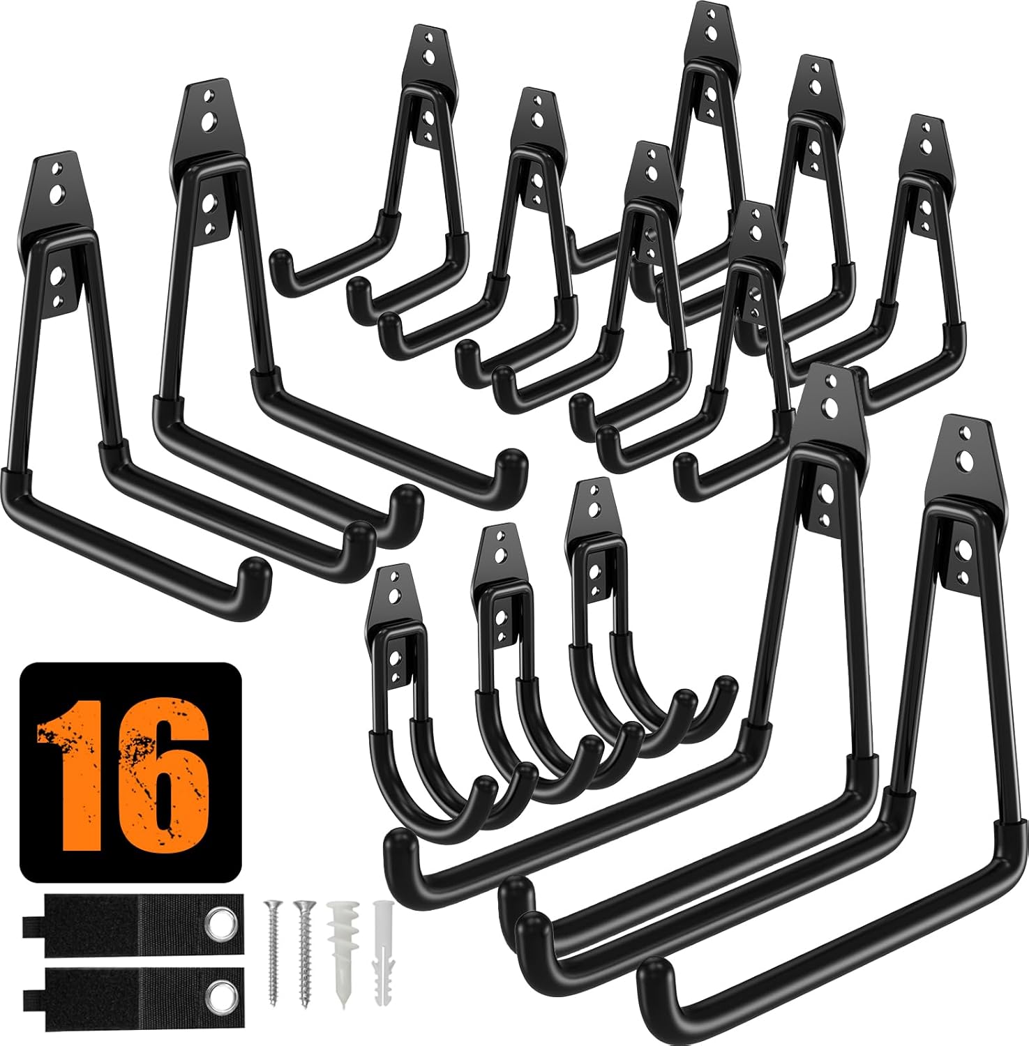 QcoQce 16 Pack Heavy Duty Garage Hooks with Extension Cord Straps, Wall Mount Hooks, Garage Organization and Tool Hangers for Bike, Ladder, Ropes and Garden Tools