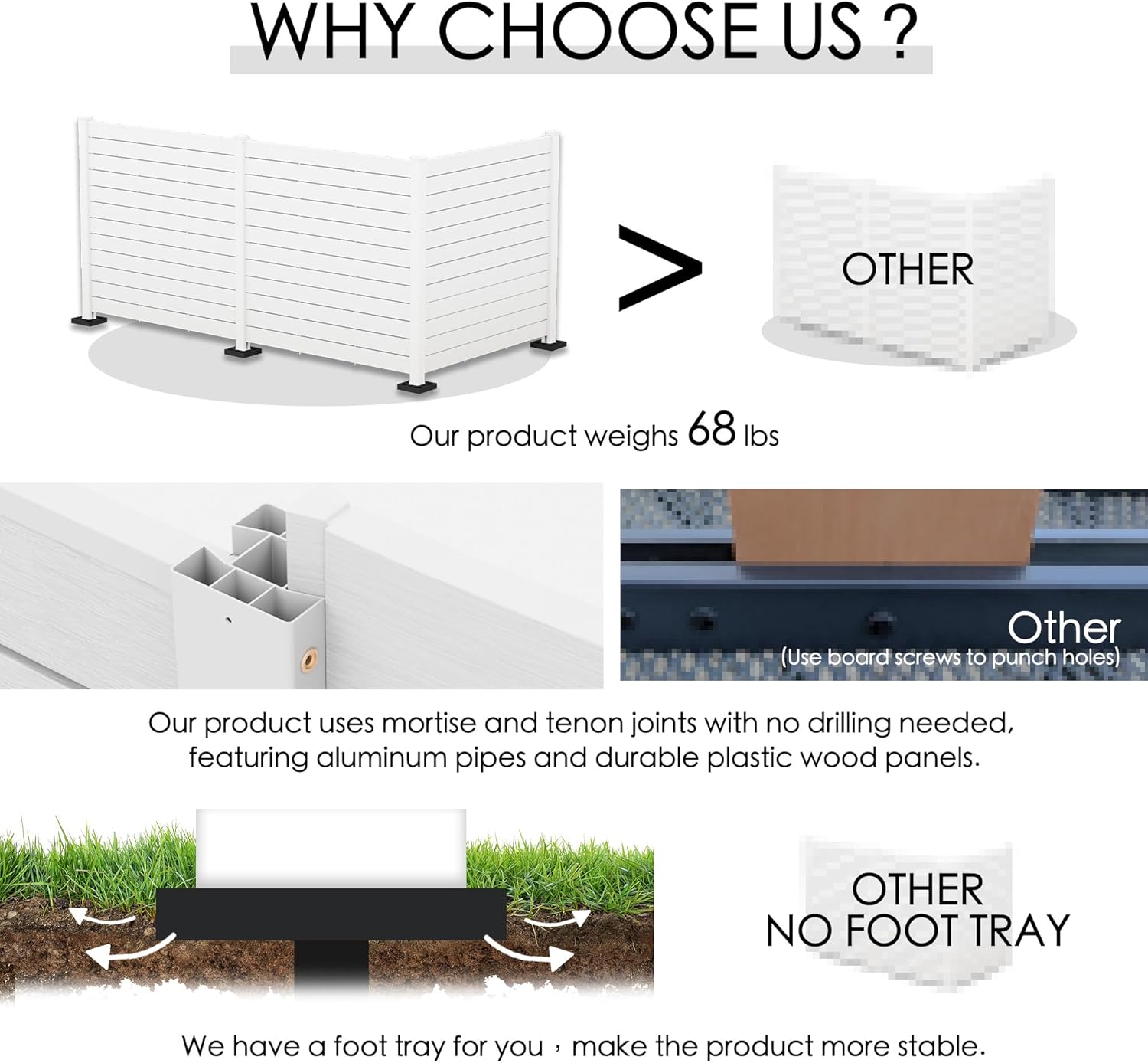 - 🏡 High-Quality Material: Our outdoor privacy screens are crafted from medium-density polyethylene, designed with a wood-like appearance that is more resistant to water and corrosion than cast iron. The 3/16-inch gaps between the boards provide ventilation while maintaining privacy. The smooth surface resists dust and stains, and the simple white color complements any setting.