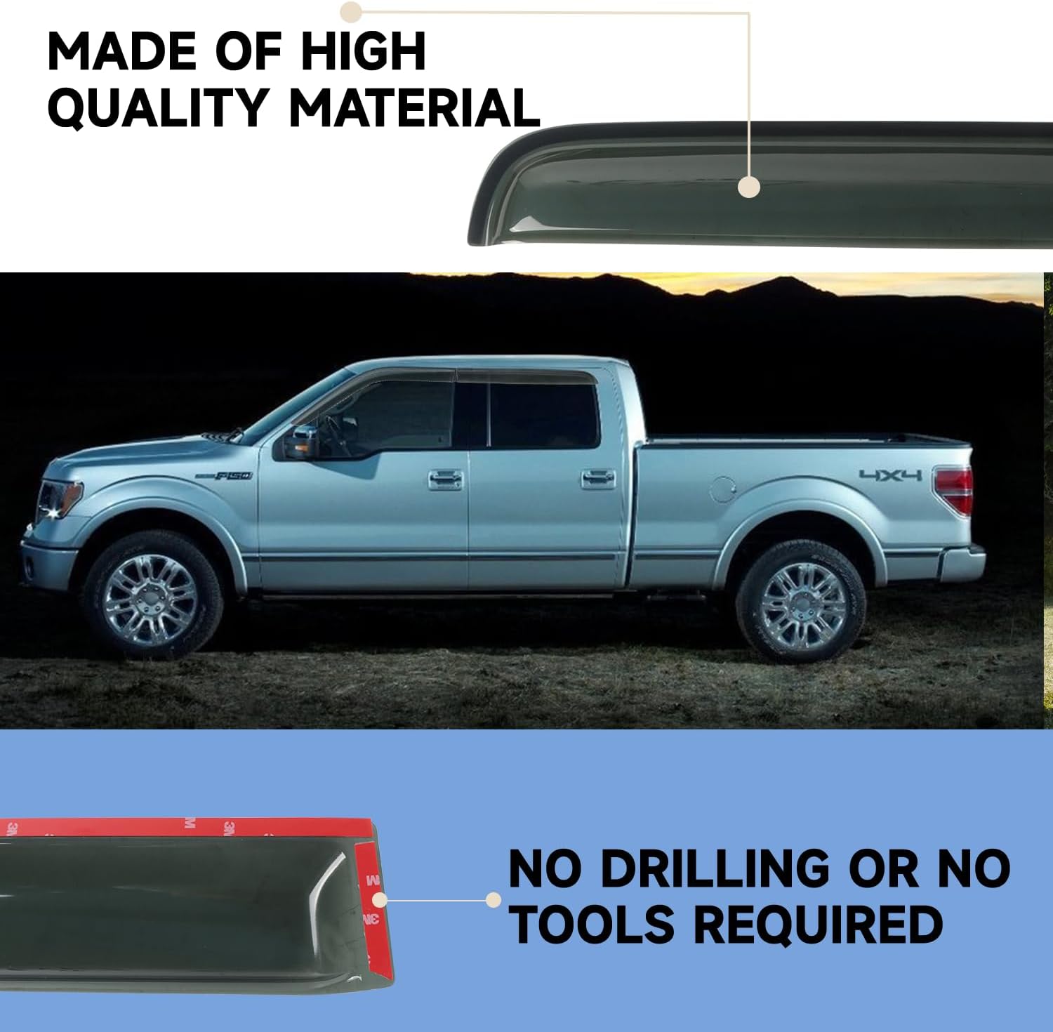 - Easy Installation: OUTSIDE MOUNT style, installs in minutes. Just tape the 3M automotive-grade adhesive on the door. No drilling or special hardware required. Please note that must be kept closed for 72 hrs after installing the window wind deflectors