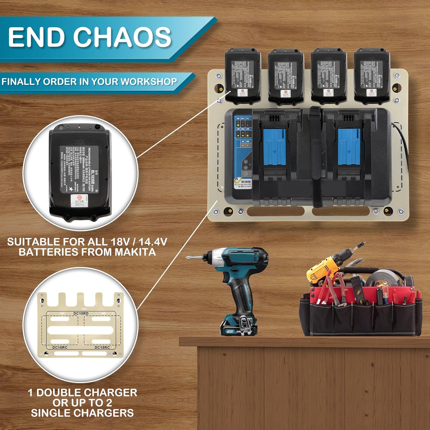 - Multi-purpose storage tool – This mount for makita battery is designed for a multi-purpose tool area and can accommodate with 2 Makita DC18RC chargers, 1 Makita DC18RD charger and 4 Makita 18V/14.4V batteries at the same time.It can effectively organize your space and make your work easier and more enjoyable.