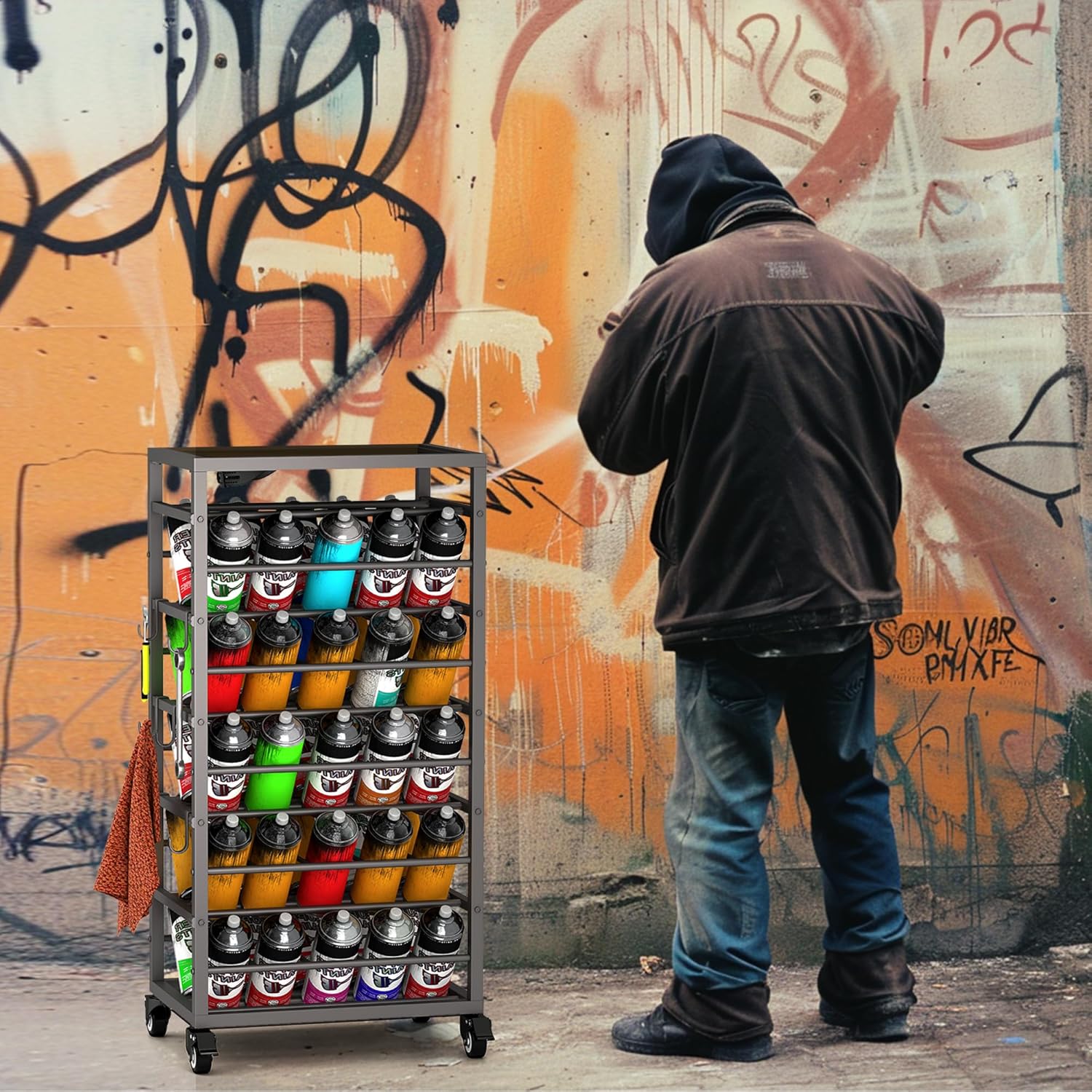 - FLEXIBLE MOBILITY: The spray paint can cart is equipped with four universal casters, two of which are lockable, allowing it to move and brake flexibly. This allows you to easily move the cart when you are doing a large area paint job