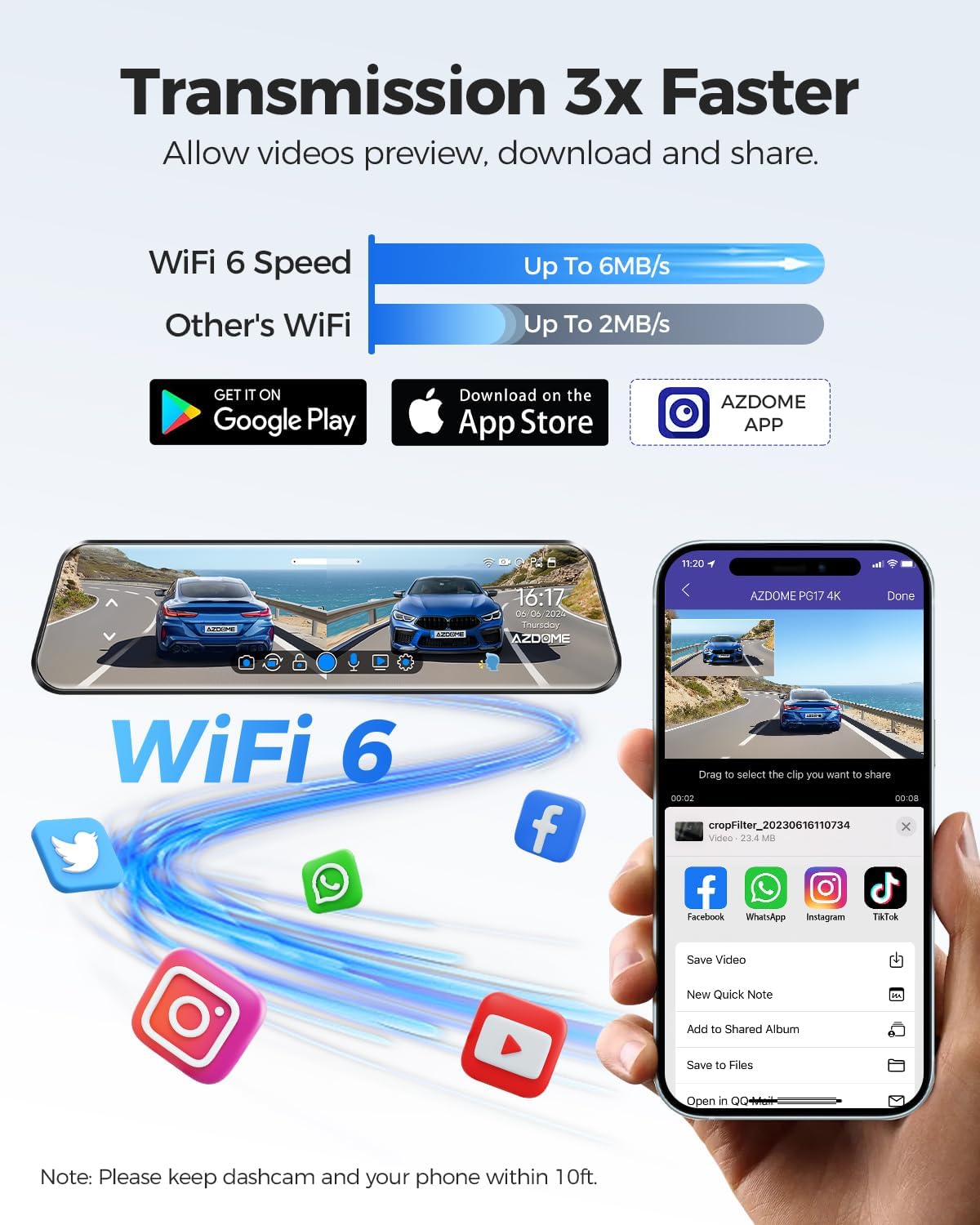 - Built-in WiFi6 - Users can simply download AZDOME app and connect dash cam to easily manage and view recordings on their smartphone. WiFi6 ensures a smoother video playback and faster download speeds, allowing user to easily share their travel experiences and wonderful moments on social media with friends and family.