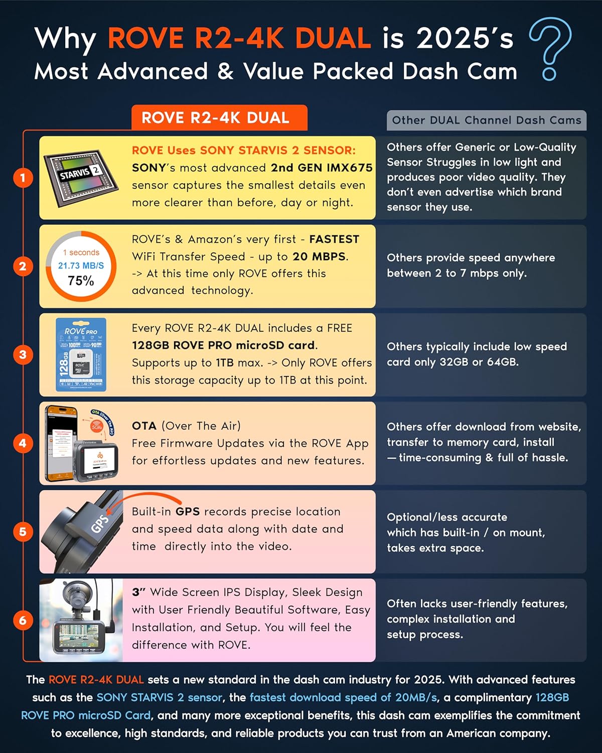 - Special Feature : 5G WiFi, Fastest Download Speed Up to 20MB/s, ROVE APP for iOS & Android, OTA (Over The Air) Firmware Updates, Built-In GPS for GEO Tagging, Live Speed, Supercapacitor for Higher Heat/Cold and Longer Product Life, Built-In Microphone, Speaker, Voice Guidance, 360° Rotation, 150°+140° True Wide Angle View, Free 128GB Memory Card Included, Up To 1TB External Storage Support, HDR (High Dynamic Range), SONY STARVIS 2 Sensor, 2024 Super Night Vision Low Light Capture Technology, 3" IPS Wider Display 5G WiFi, Fastest Download Speed Up to 20MB/s, ROVE APP for iOS & Android, OTA (Over The Air) Firmware Updates, Built-In GPS for GEO Tagging, Live Speed, Supercapacitor… See more