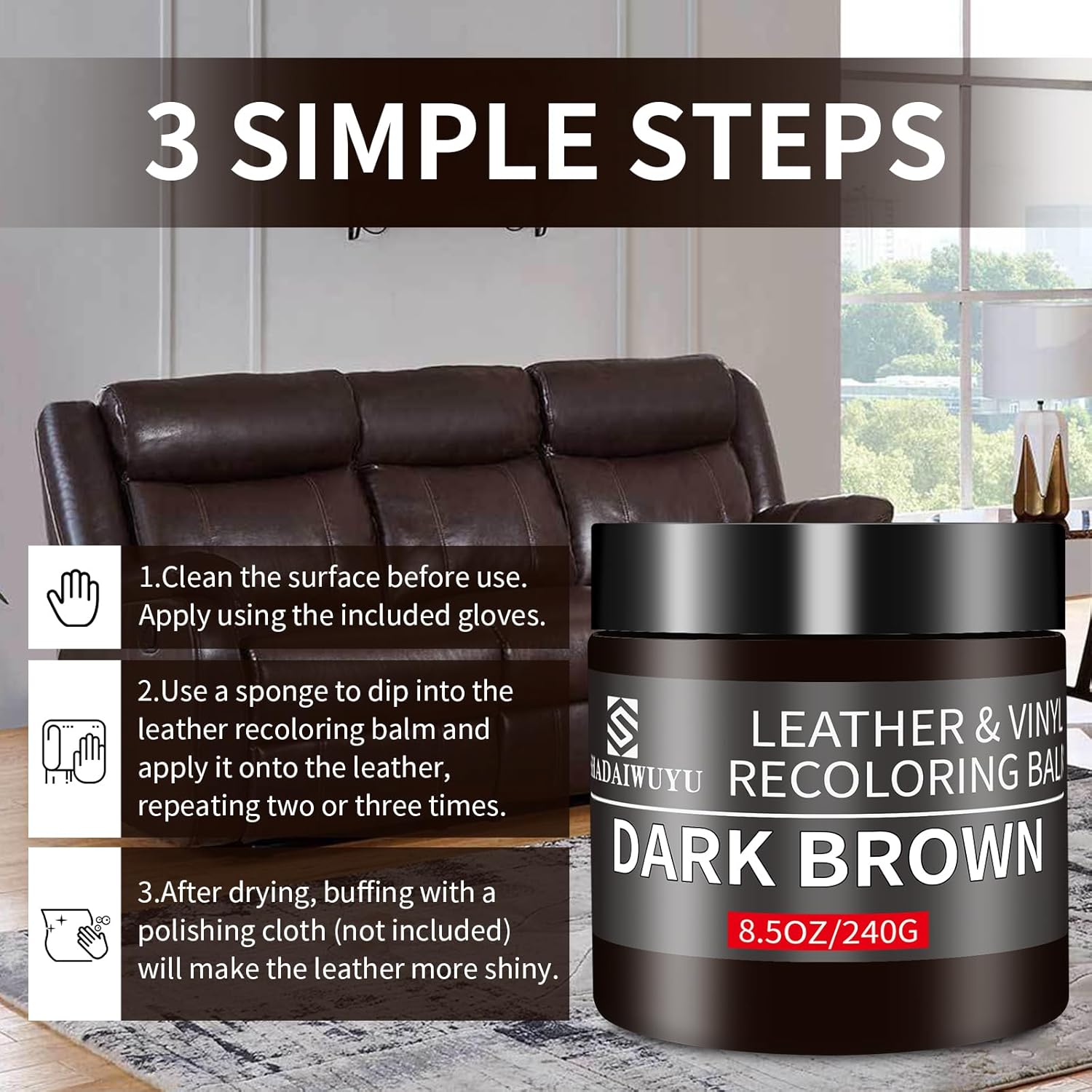 Leather Recoloring Balm,8.5oz Leather Color Restorer,Dark Brown Leather Repair kit for Furniture and Car Interior,Leather Couch Scratch Repair,Leather Dye Paint for Faded,Cracked and Damaged Leather
