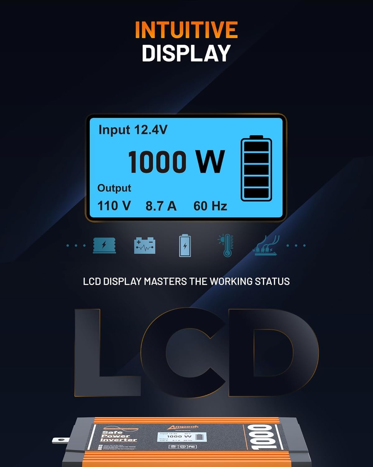 - Precision LCD Display: Ampeak 1000w power inverter features a state-of-the-art internal software that enhances the accuracy of the LCD display, making it effortless to read vital information such as input/output voltage, current, and power. This ensures seamless data management and a stable power supply for all your devices.
