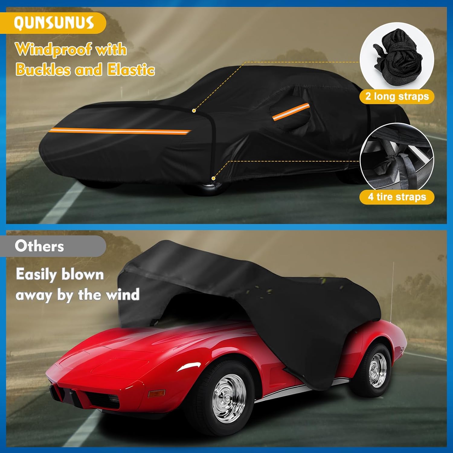 - 【Windproof Design-Stay in Place】*1. Four straps used on the four wheels to make sure the cover stay in the place. *2. A windproof buckle pass through the middle of the car. *3. Elastic Strap at the bottom of front and rear to ensure cover fit your car and to protect your car cover from blowing off, even in heavy wind.