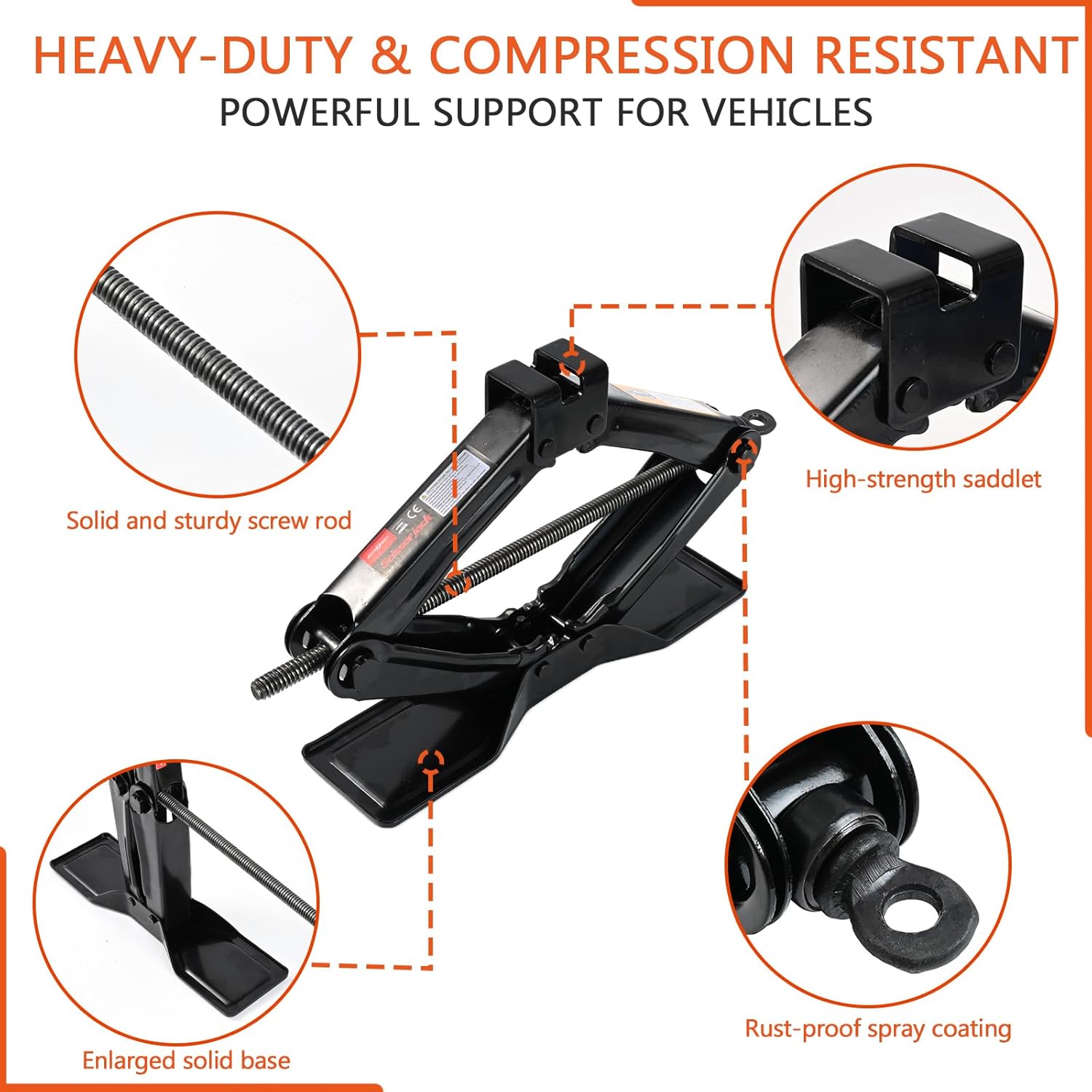 - 2.[ Wide base Support]: Equipped with an extra-wide base which adds stability and strength; and card slot supporting head that sticks to the bottom of your car without slipping off. 2 ton scissor jack is tire lifting tool for quick jack car lift