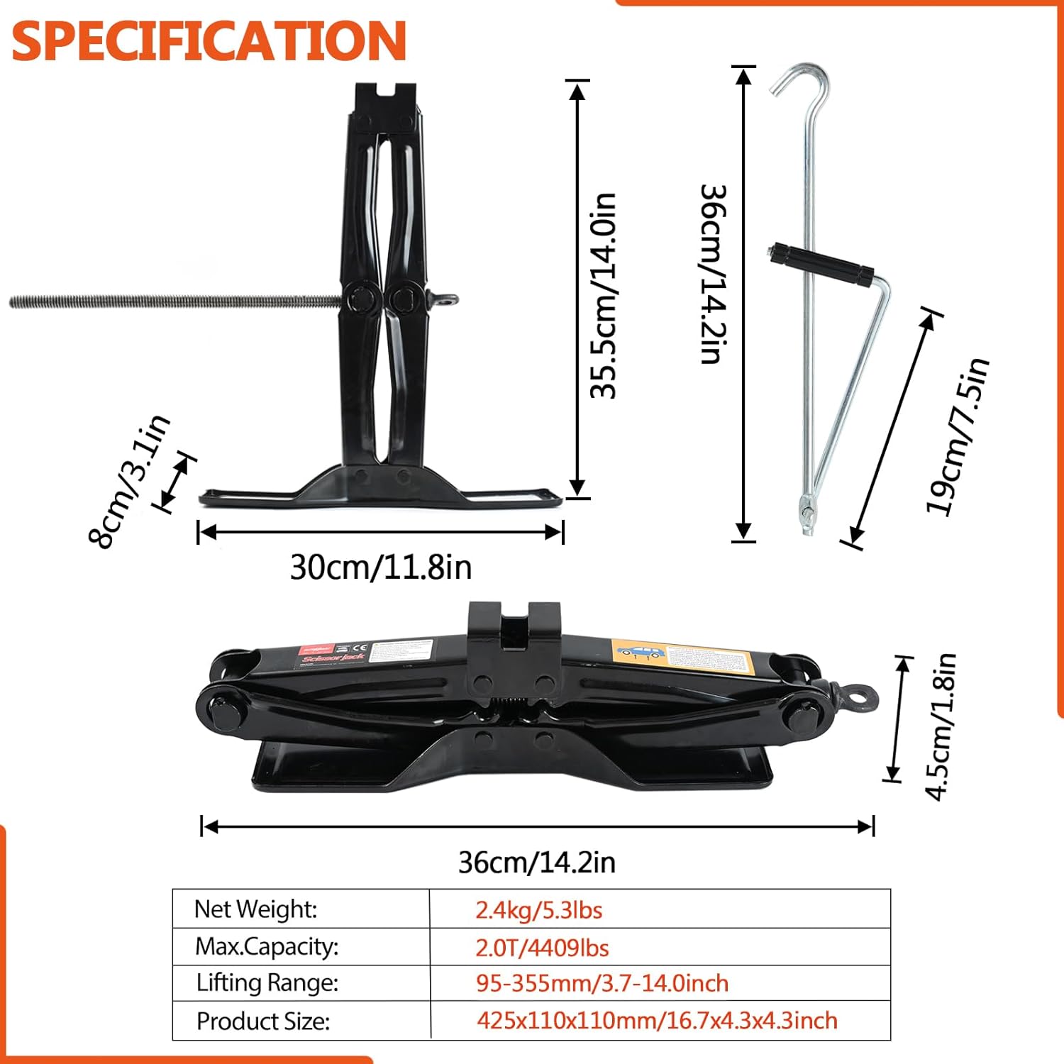 - 1.[Specifications:]: Collapsible. lifting capacity: 2 tons (4409lbs lbs). Our 2 tons (4409lbs lbs) scissor jack delivers exceptional versatility and outstanding bearing capacity for all your tire-changing needs. Our steel scissor jack is compatible with cars, SUVs, perfect for emergency situations where you need to change a flat tire or perform other vehicle repairs