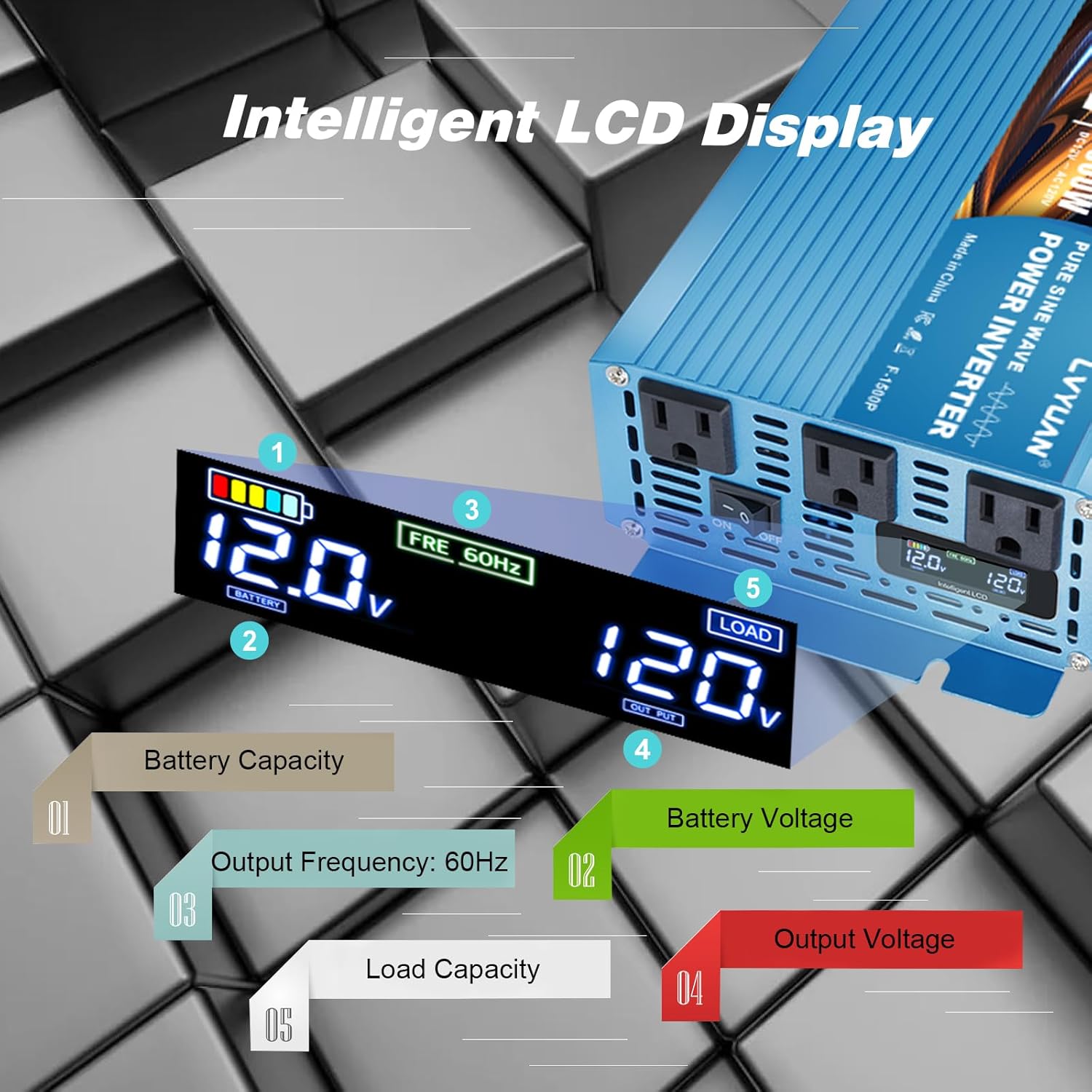 LVYUAN 1500 Watt Pure Sine Wave Inverter 12V to 110V 120V DC to AC with LCD Display, 3 U.S. Outlet, USB Charger Ports, Car Power Inverter for Vehicles, RV, Outdoor, Home