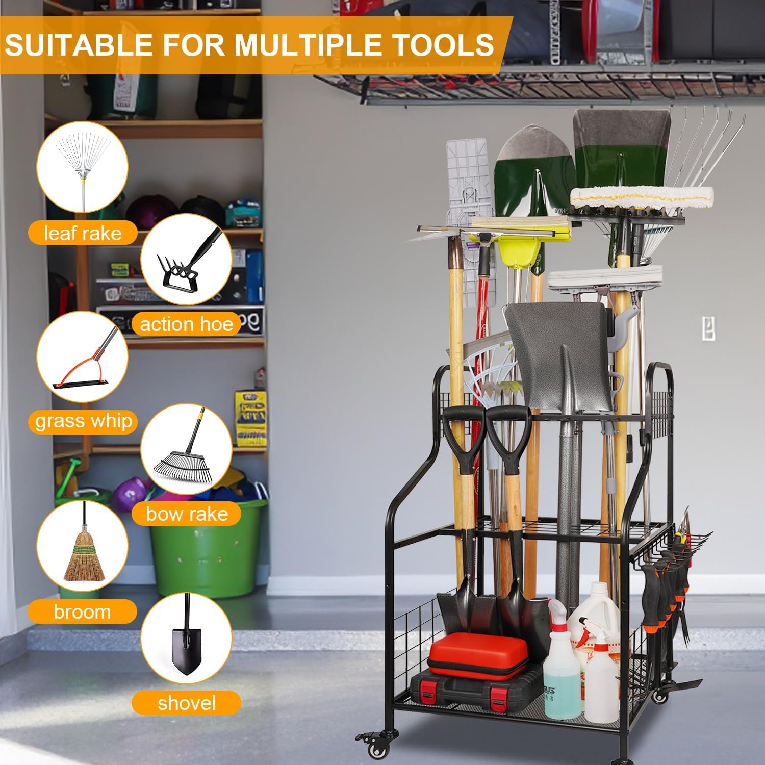 - 【Multiple Occasions】This garage tool organizer is suitable for a wide range of tools including garden tools, farm tools and cleaning tools such as D-handle tools, rakes, shovels, brooms, mops, pruning sticks and more.In addition, this 3-tier design garden tool storage is suitable for a variety of indoor and outdoor occasions, which can effectively organize tools in your garden, shed, garage, patio, basement or lawn, making your garage storage and garden storage a breeze.