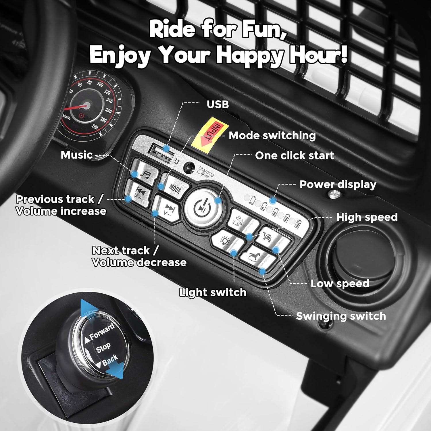 - Realistic Driving Experience: This electric car for kids can be connected with bluetooth, equipped with LED headlights, built-in horn and music, illuminated dashboard, MP3 and USB outlets. Most importantly, our ride-on truck features a front and rear rocking function for an extra fun driving experience