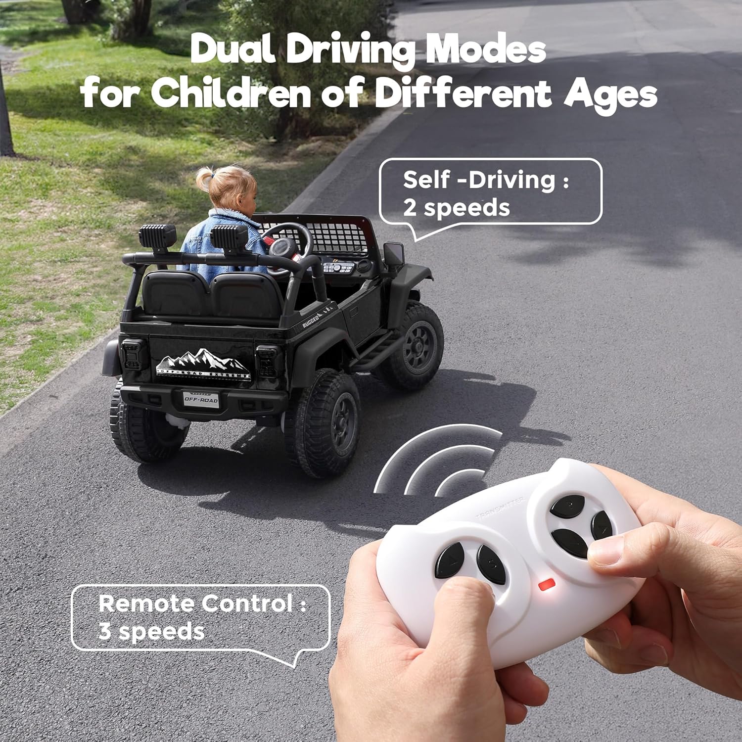 - Dual Modes for Safety and Independence: The kids electric car offers two driving modes—parent remote control mode for safe steering and self-driving mode for independent exploration. Perfect for toddlers under parental guidance or older kids ready to take the car, it ensures both safety and endless fun