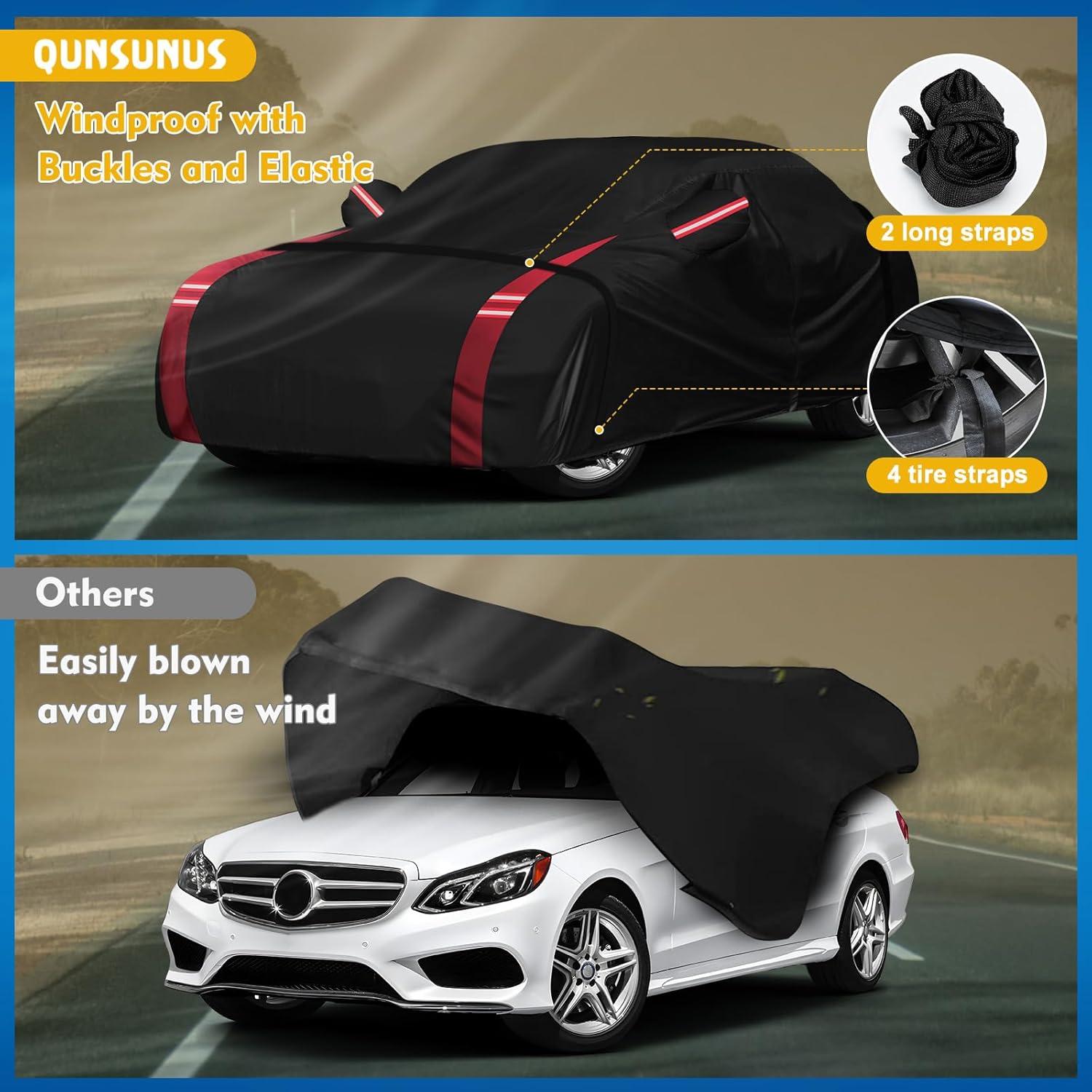 - 【Windproof Design-Stay in Place】*1. Four straps used on the four wheels to make sure the cover stay in the place. *2. A windproof buckle pass through the middle of the car. *3. Elastic Strap at the bottom of front and rear to ensure cover fit your car and to protect your car cover from blowing off, even in heavy wind.