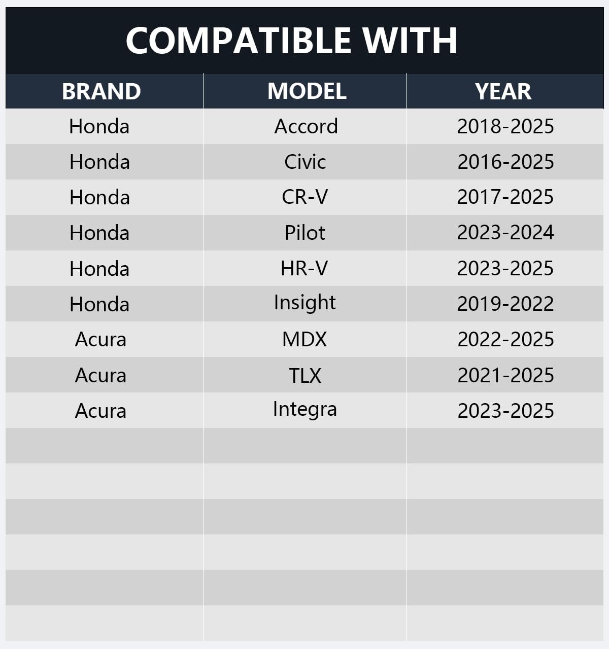 - Suitable Models: Compatible with Honda Accord 2018-2025, Civic 2016- 2025, CRV 2017-2025, Pilot 2023-2024, HRV 2023-2025, Insight 2019-2022; Acura MDX 2022-2025, TLX 2021-2025, Integra 2023-2025