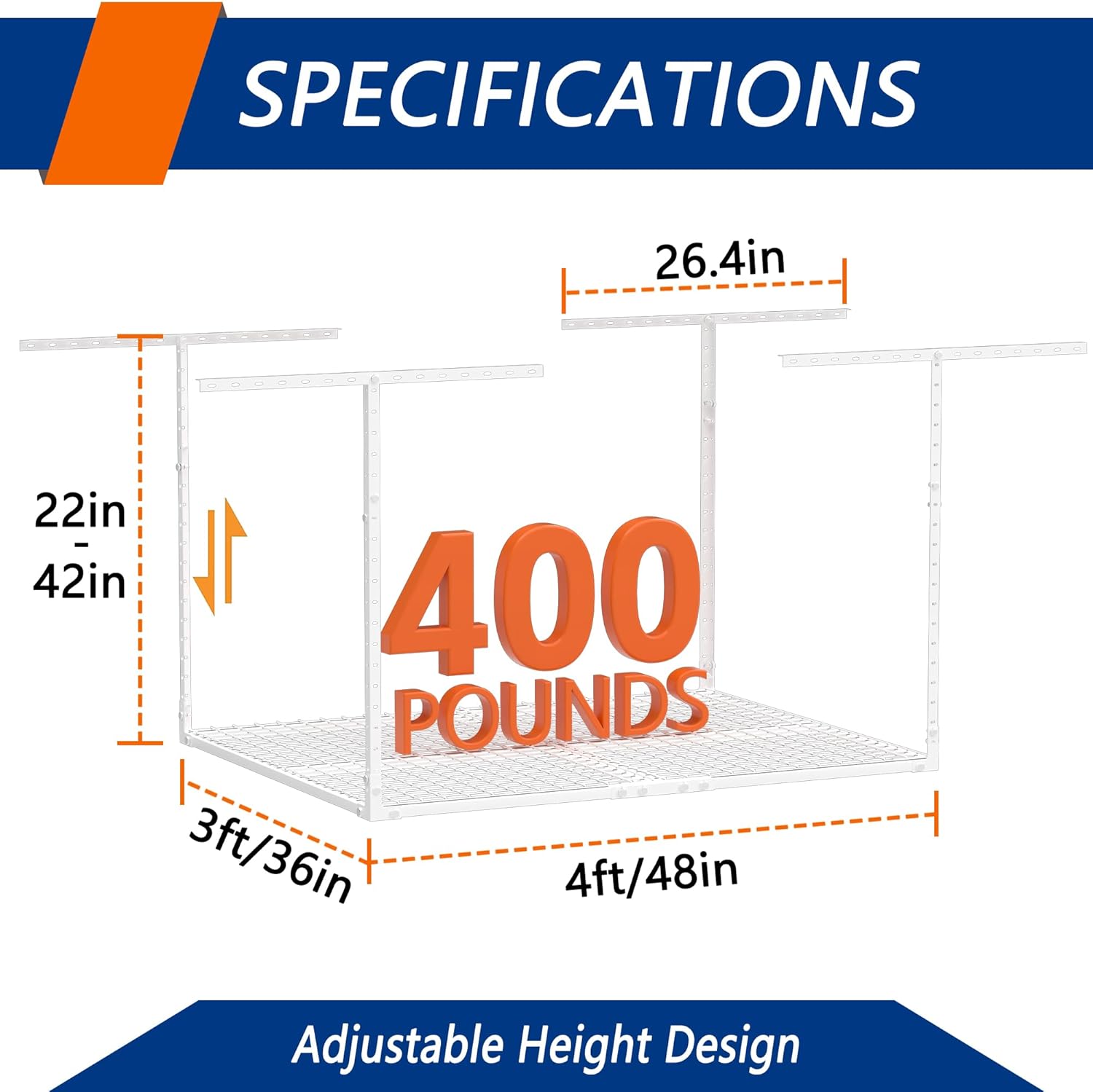 - ADJUSTABLE HEIGHT: Our garage storage racks are height adjustable,giving you the freedom to adjust the distance between the rack and the ceiling from 22 inches to 42 inches. This 3FT x 4FT ceiling mount rack adds up to 40 cubic feet of storage space.