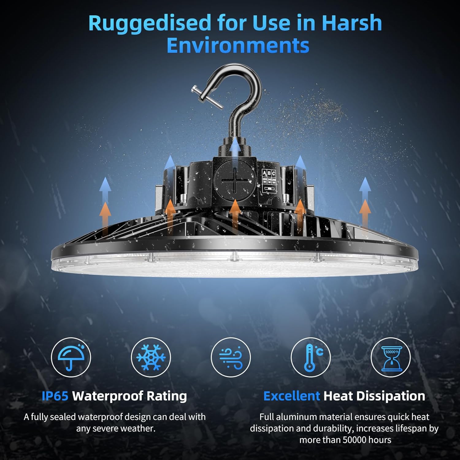 - IP65 Waterproof & Long-Lasting Lifetime : LED high bay light equipped with industrial grade material of durable SMD2835 chips, die-casting aluminum body of excellent heat dissipation, energy-efficient LED driver and protective PC cover, lasting for more than 50,000 hours. IP65 rated waterproof and dustproof design, which is ideal for indoor or outdoor using