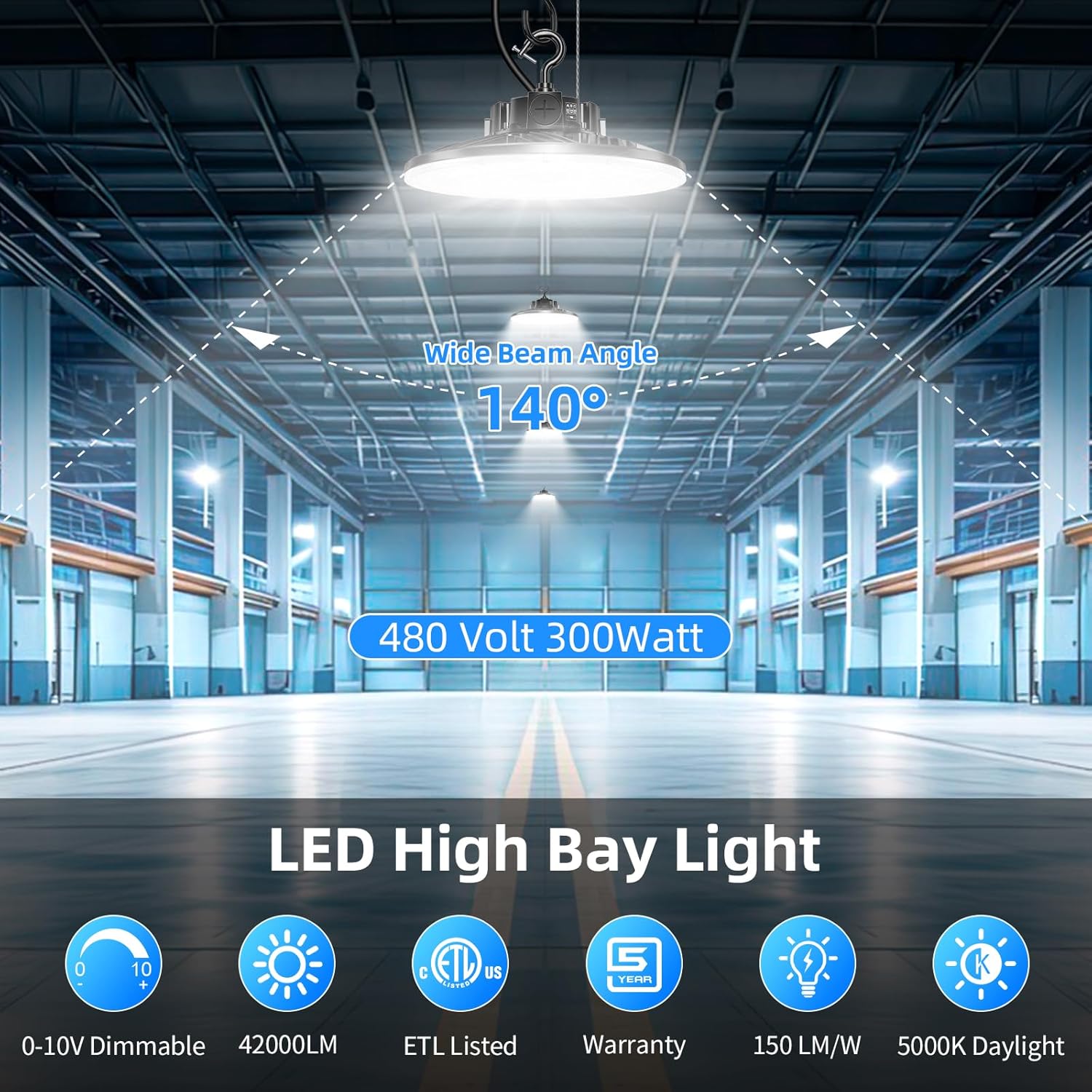 480V LED High Bay Light 300W 240W 200W Adjustable UFO Light 42000LM ETL DLC Listed Dimmable High Bay LED Shop Lights 5000K Daylight IP65 Waterproof Commercial Bay Lighting for Warehouse Factory