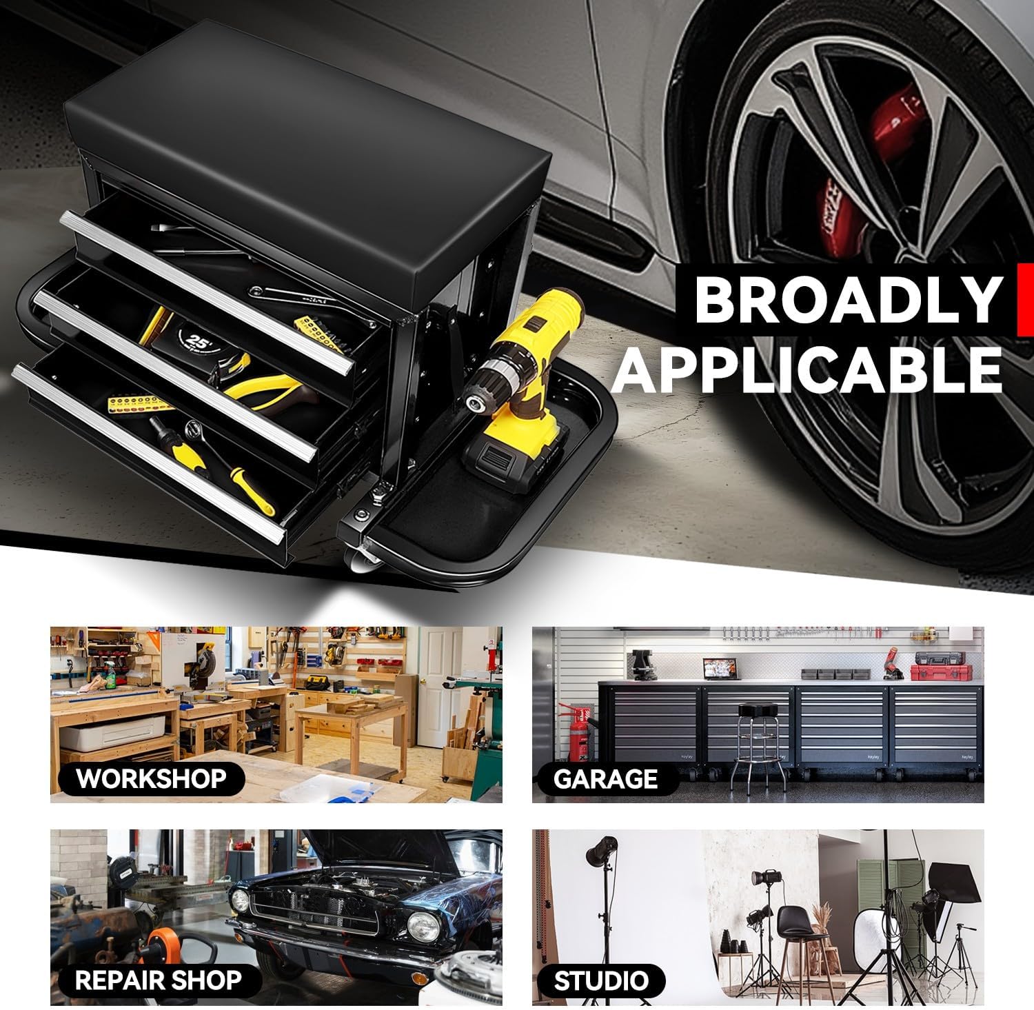 - Material: This 3-drawer rolling mechanics seat is made of reinforced metal, which can provide stability, equipped with a padded cushion that offers comfort for extended work sessions.