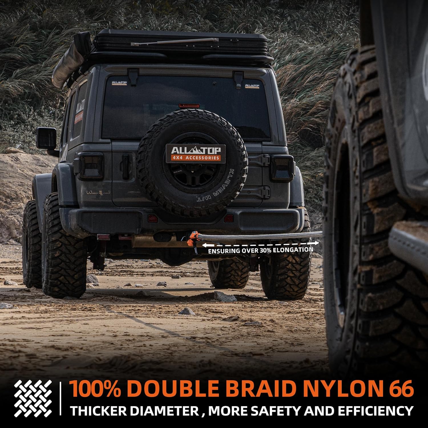 - 【KINETIC SNATCHING】 Length: 30ft/9M. Diameter: 1in/25mm. Color: Gray rope with Orange protective sleeves for Safer Recovery. 100% Nylon N66 features ALL-TOP Kinetic Rope like a rubber band, by its over 30% elasticity, storing & releasing Kinetic Energy will help you get unstuck easily. And less likely to cause Vehicle Frame Damage compared to normal tow straps.