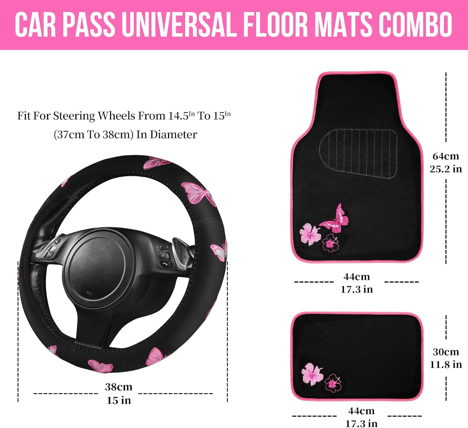 - Universal Fit - Fits all standard steering wheels 14.5" to 15" for vehicles, suvs, vans,cars,sedan and small trucks. our black and pink car mats shape and size is engineered to fit most Cars, Trucks, Vans and SUVs. Front (25.2"L x 17.3W) Rear (11.8"L x 17.3"W) - Please Make Sure to Check Measurements Before Installation.