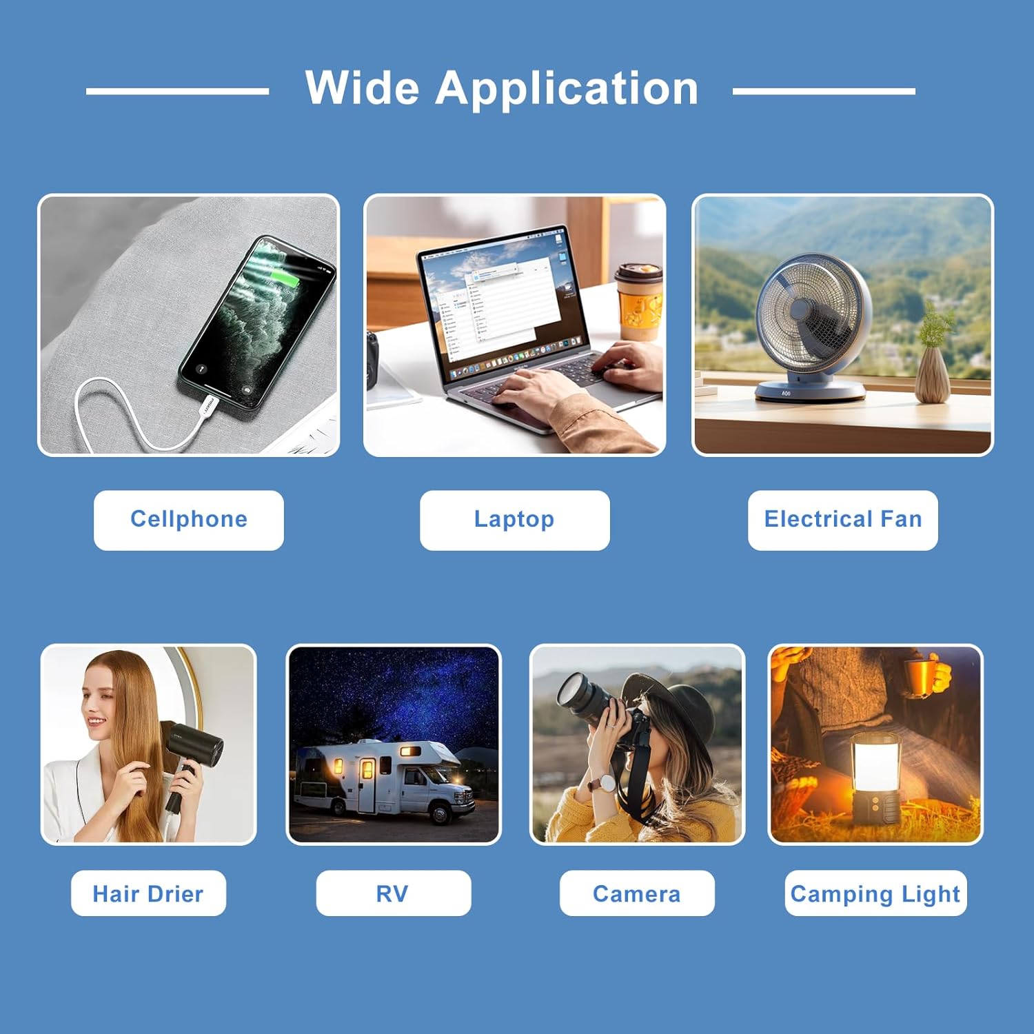 - Recommended Uses For Product : Car, Travel, Office, Laptop, Small electronics, Camping, Household appliances, Smart phone, Tablet, Recreational Vehicle, Boat, Digital camera, Pump, Workshop, Hurricane, Compressor, Storm, Grinder Car, Travel, Office, Laptop, Small electronics, Camping, Household appliances, Smart phone, Tablet, Recreational Vehicle, Boat, Digital camera, Pump, Workshop, Hurricane, Compressor, Storm, Grinder