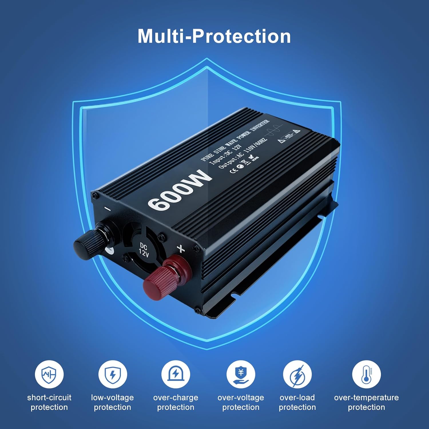 - 【Multi-】: Pure sine power inverter for charging design provides full- with short-circuit, low-voltage, over-, over-voltage, over-load, over-temperature