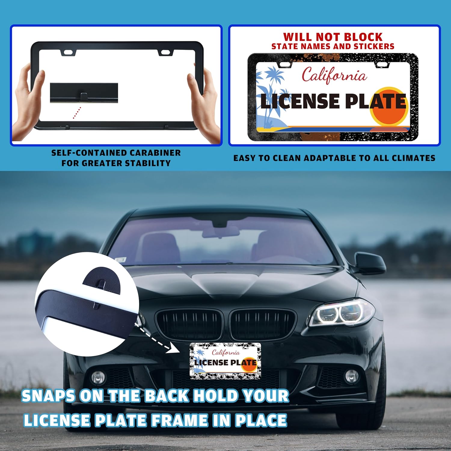 - INTERNAL CLIP FIXATION:There are 2 back clips at the bottom of the back of the license plate frame, which can fix the license plate more stably, allowing you to make no noise while driving, and will not wear the car paint, which is safe rest assured.