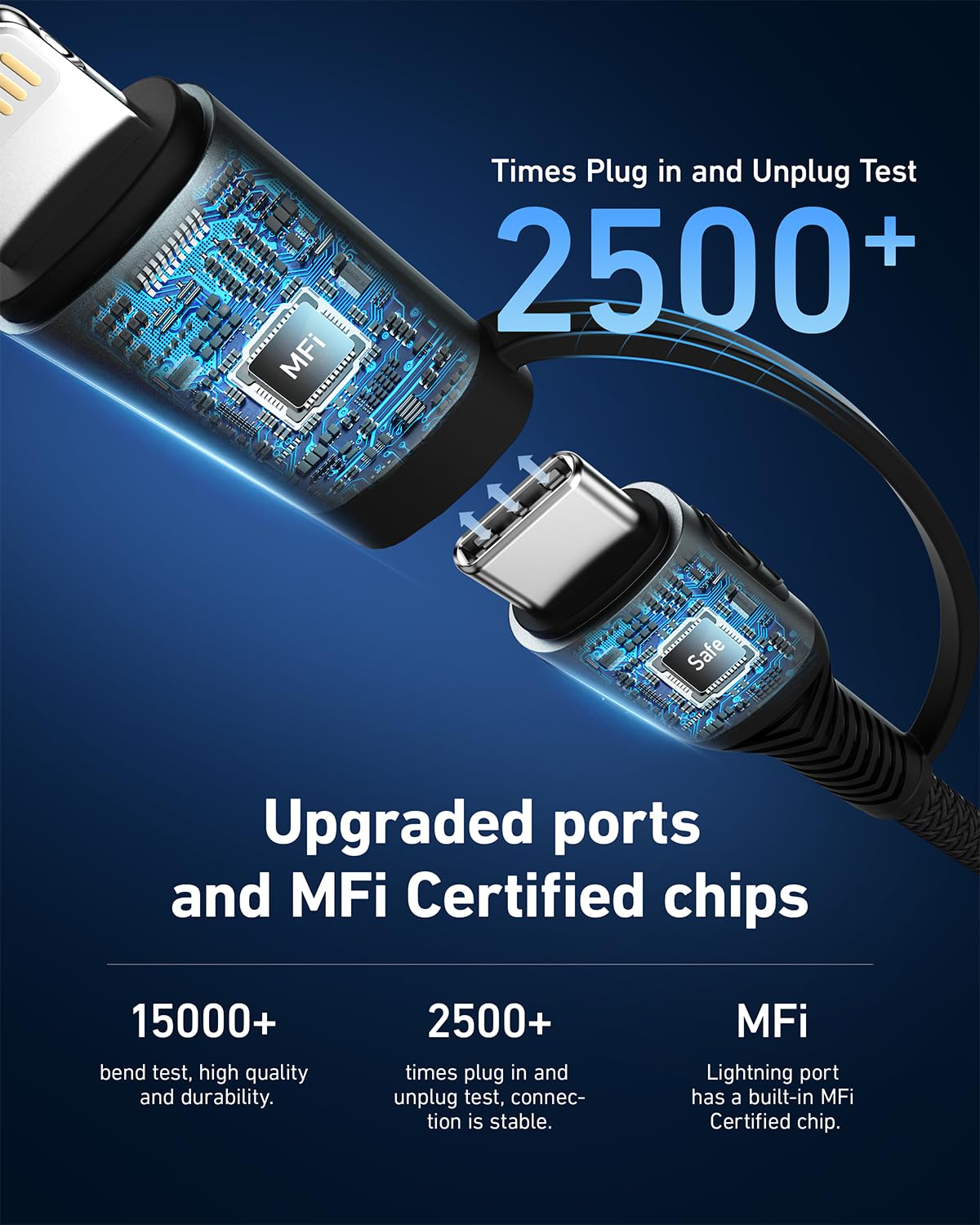 - 66 W Fast Charging and Data Sync : USB C to USB C Cable supports devices with a maximum current of 3 A. It has a maximum power of 66W (20V/3A), which can quickly and safely charge your iPhone 15. This C to Lighting Cable has a built-in MFi Certified chip and supports all iOS versions. It also supports data transfer speeds of up to 480 Mbps, making it easy to transfer photos, music, videos and files in seconds.